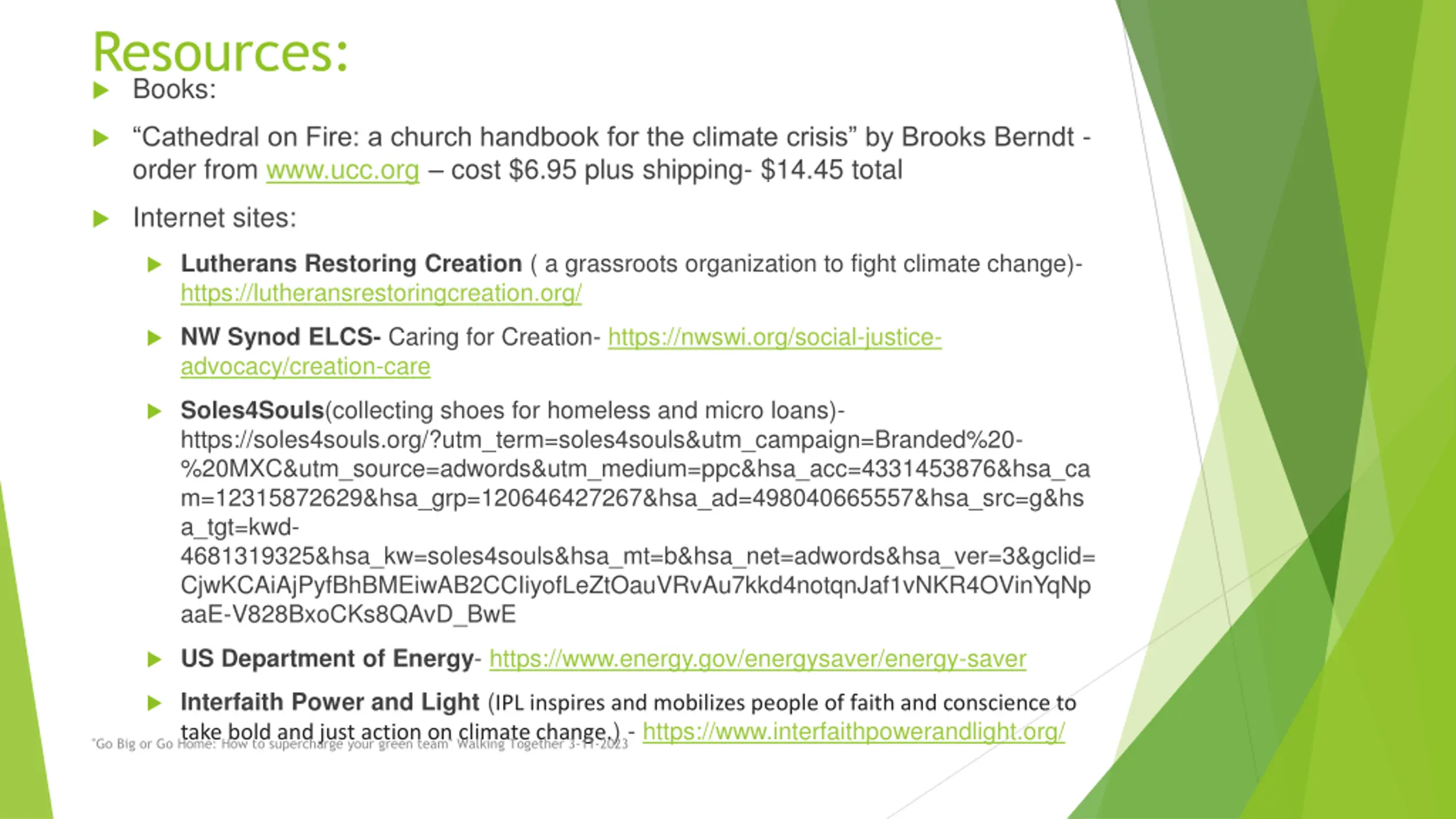 Resources: Books: Cathedral on Fire: a church handbook for the climate crisis by Brooks Berndt - order from www.ucc.org cost $6.95 plus shipping- $14.45 total Internet sites: Lutherans Restoring Creation ( a grassroots organization to fight climate change)- https://lutheransrestoringcreation.org/ NW Synod ELCS- Caring for Creation- https://nwswi.org/social-justice- advocacy/creation-care Soles4Souls(collecting shoes for homeless and micro loans)- https://soles4souls.org/?utm_term=soles4souls&utm_campaign=Branded%20- %20MXC&utm_source=adwords&utm_medium=ppc&hsa_acc=4331453876&hsa_ca m=12315872629&hsa_grp=120646427267&hsa_ad=498040665557&hsa_src=g&hs a_tgt=kwd- 4681319325&hsa_kw=soles4souls&hsa_mt=b&hsa_net=adwords&hsa_ver=3&gclid= CjwKCAiAjPyfBhBMEiwAB2CCIiyofLeZtOauVRvAu7kkd4notqnJaf1vNKR4OVinYqNp aaE-V828BxoCKs8QAvD_BwE US Department of Energy- https://www.energy.gov/energysaver/energy-saver Interfaith Power and Light (IPL inspires and mobilizes people of faith and conscience to take bold and just action on climate change.) - https://www.interfaithpowerandlight.org/ "Go Big or Go Home: How to supercharge your green team" Walking Together 3-11-2023
