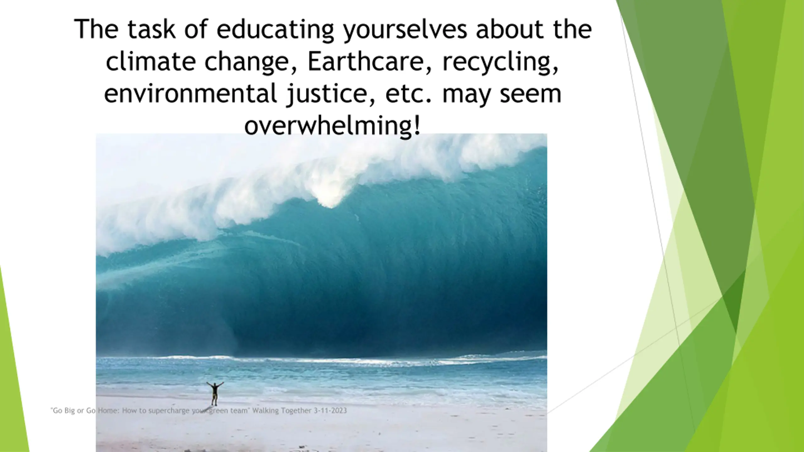 The task of educating yourselves about the climate change, Earthcare, recycling, environmental justice, etc. may seem overwhelming! "Go Big or Go Home: How to supercharge your green team" Walking Together 3-11-2023