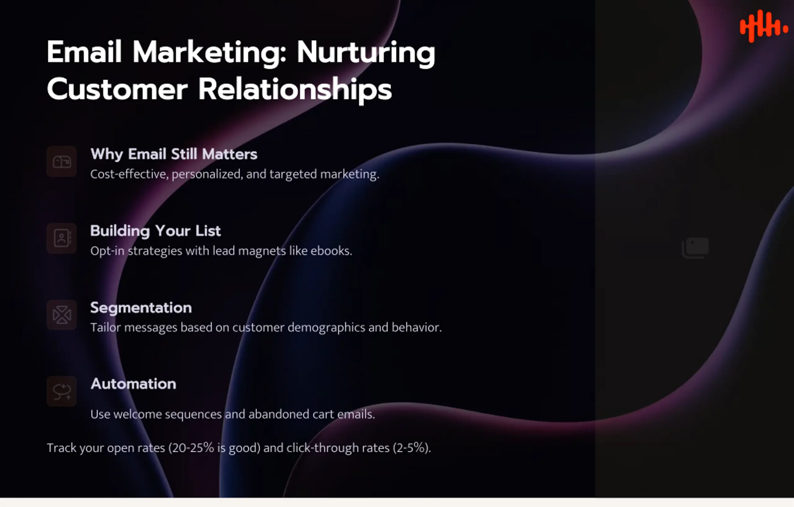 Email Marketing: Nurturing Customer Relationships Email Marketing: Nurturing Customer Relationships Why Email Still Matters Cost-effective, personalized, and targeted marketing. Why Email Still Matters Building Your List Opt-in strategies with lead magnets like ebooks. Building Your List Segmentation Tailor messages based on customer demographics and behavior. Segmentation Automation Automation Use welcome sequences and abandoned cart emails. Track your open rates (20-25% is good) and click-through rates (2-5%).