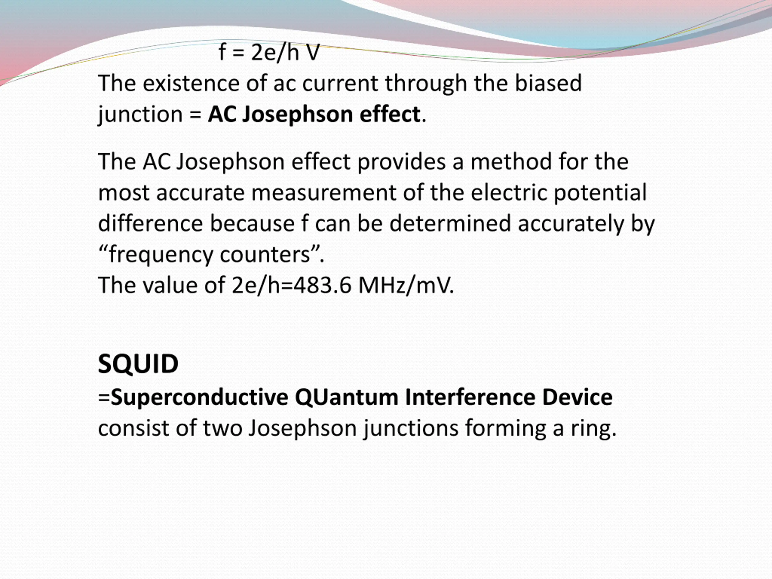f = 2e/h V The existence of ac current through the biased junction = AC Josephson effect. The AC Josephson effect provides a method for the most accurate measurement of the electric potential difference because f can be determined accurately by frequency counters . The value of 2e/h=483.6 MHz/mV. SQUID =Superconductive QUantum Interference Device consist of two Josephson junctions forming a ring.