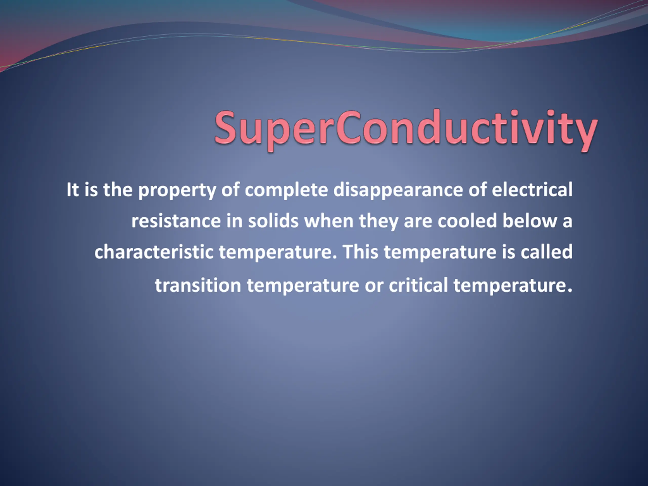 It is the property of complete disappearance of electrical resistance in solids when they are cooled below a characteristic temperature. This temperature is called transition temperature or critical temperature.