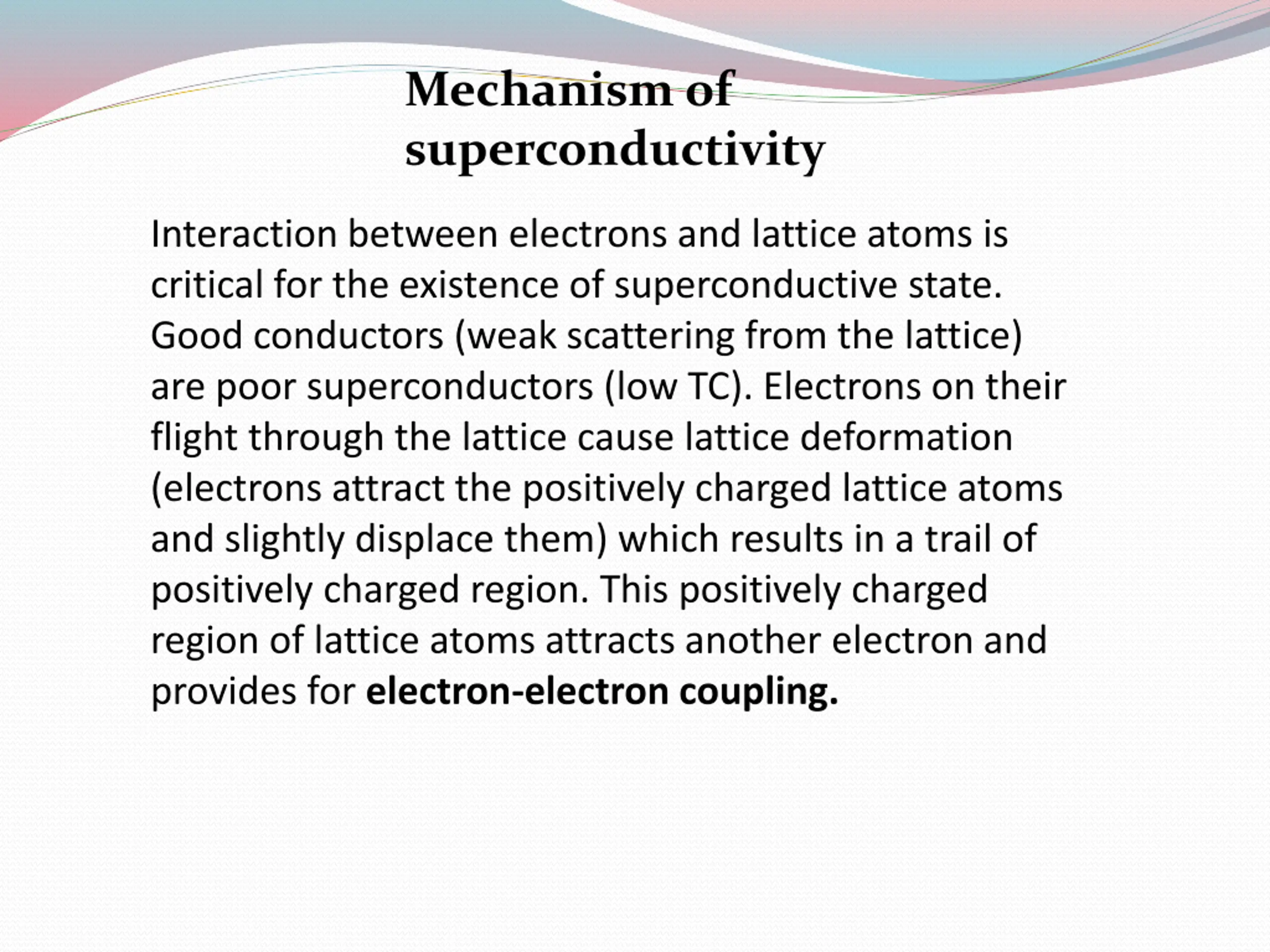 Mechanism of superconductivity Interaction between electrons and lattice atoms is critical for the existence of superconductive state. Good conductors (weak scattering from the lattice) are poor superconductors (low TC). Electrons on their flight through the lattice cause lattice deformation (electrons attract the positively charged lattice atoms and slightly displace them) which results in a trail of positively charged region. This positively charged region of lattice atoms attracts another electron and provides for electron-electron coupling.