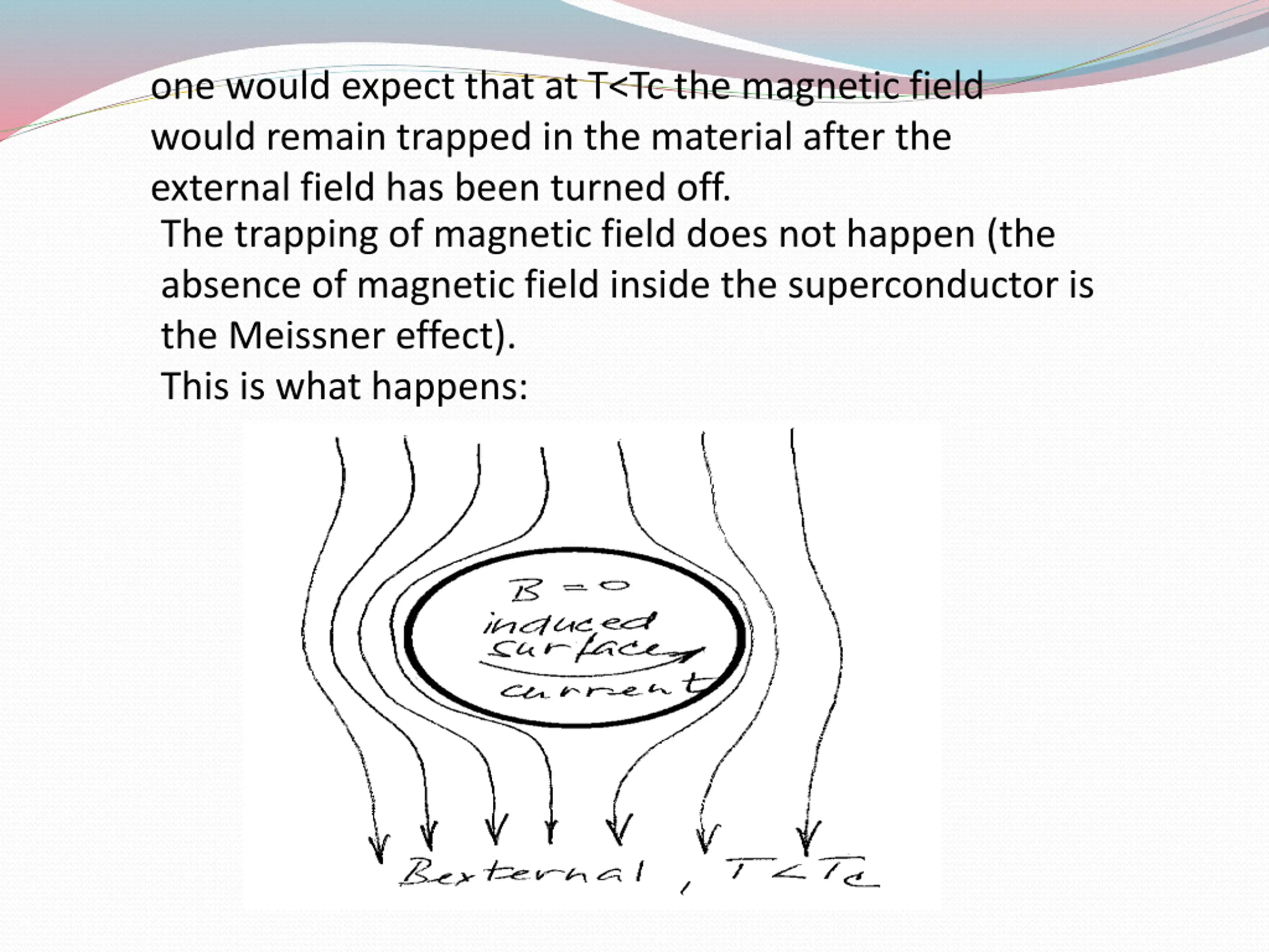 one would expect that at T<Tc the magnetic field would remain trapped in the material after the external field has been turned off. The trapping of magnetic field does not happen (the absence of magnetic field inside the superconductor is the Meissner effect). This is what happens: