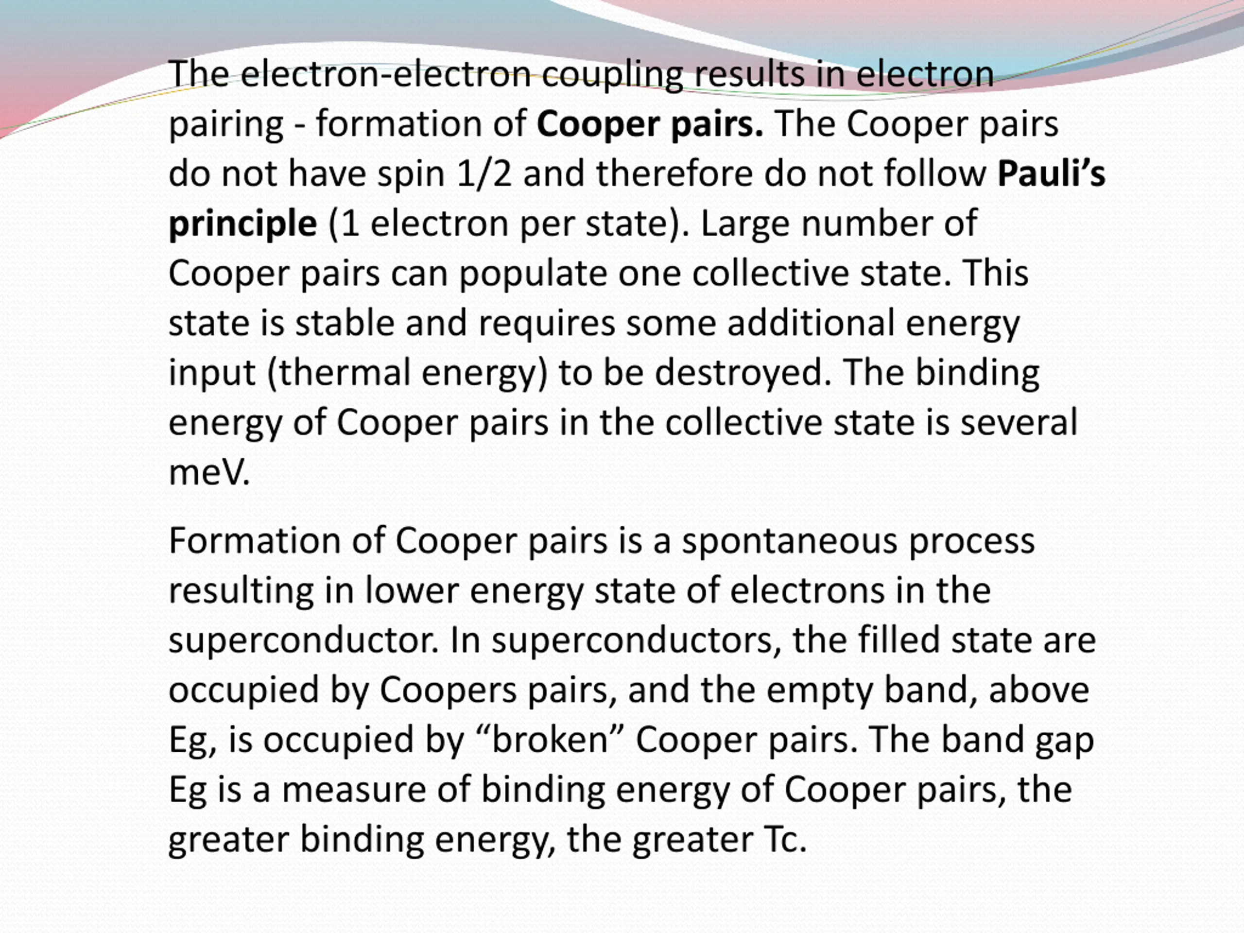 The electron-electron coupling results in electron pairing - formation of Cooper pairs. The Cooper pairs do not have spin 1/2 and therefore do not follow Pauli s principle (1 electron per state). Large number of Cooper pairs can populate one collective state. This state is stable and requires some additional energy input (thermal energy) to be destroyed. The binding energy of Cooper pairs in the collective state is several meV. Formation of Cooper pairs is a spontaneous process resulting in lower energy state of electrons in the superconductor. In superconductors, the filled state are occupied by Coopers pairs, and the empty band, above Eg, is occupied by broken Cooper pairs. The band gap Eg is a measure of binding energy of Cooper pairs, the greater binding energy, the greater Tc.