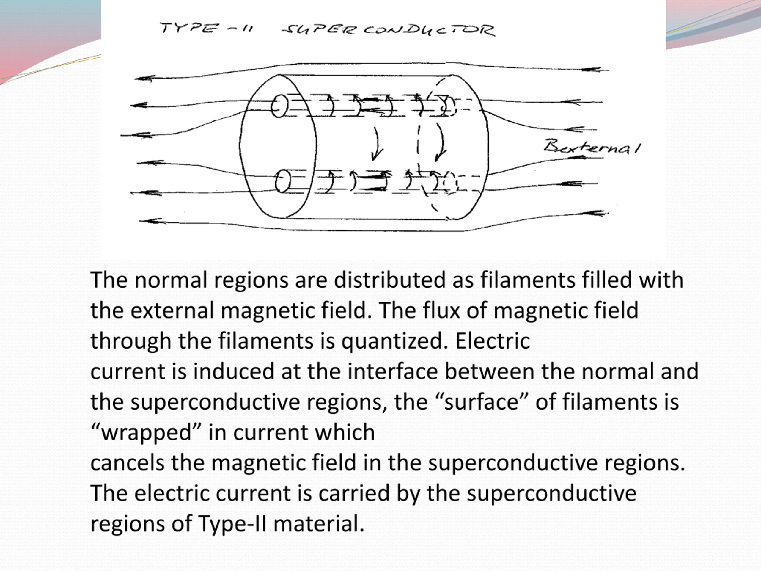 The normal regions are distributed as filaments filled with the external magnetic field. The flux of magnetic field through the filaments is quantized. Electric current is induced at the interface between the normal and the superconductive regions, the surface of filaments is wrapped in current which cancels the magnetic field in the superconductive regions. The electric current is carried by the superconductive regions of Type-II material.