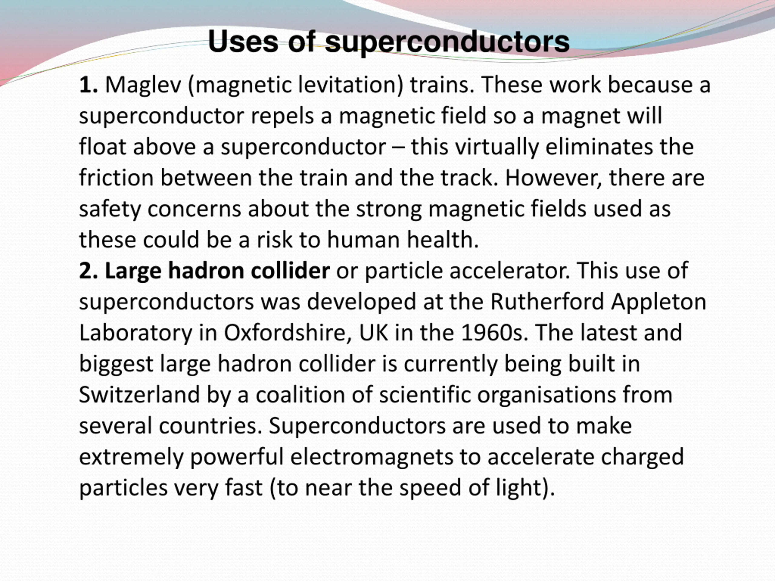 Uses of superconductors 1. Maglev (magnetic levitation) trains. These work because a superconductor repels a magnetic field so a magnet will float above a superconductor this virtually eliminates the friction between the train and the track. However, there are safety concerns about the strong magnetic fields used as these could be a risk to human health. 2. Large hadron collider or particle accelerator. This use of superconductors was developed at the Rutherford Appleton Laboratory in Oxfordshire, UK in the 1960s. The latest and biggest large hadron collider is currently being built in Switzerland by a coalition of scientific organisations from several countries. Superconductors are used to make extremely powerful electromagnets to accelerate charged particles very fast (to near the speed of light).
