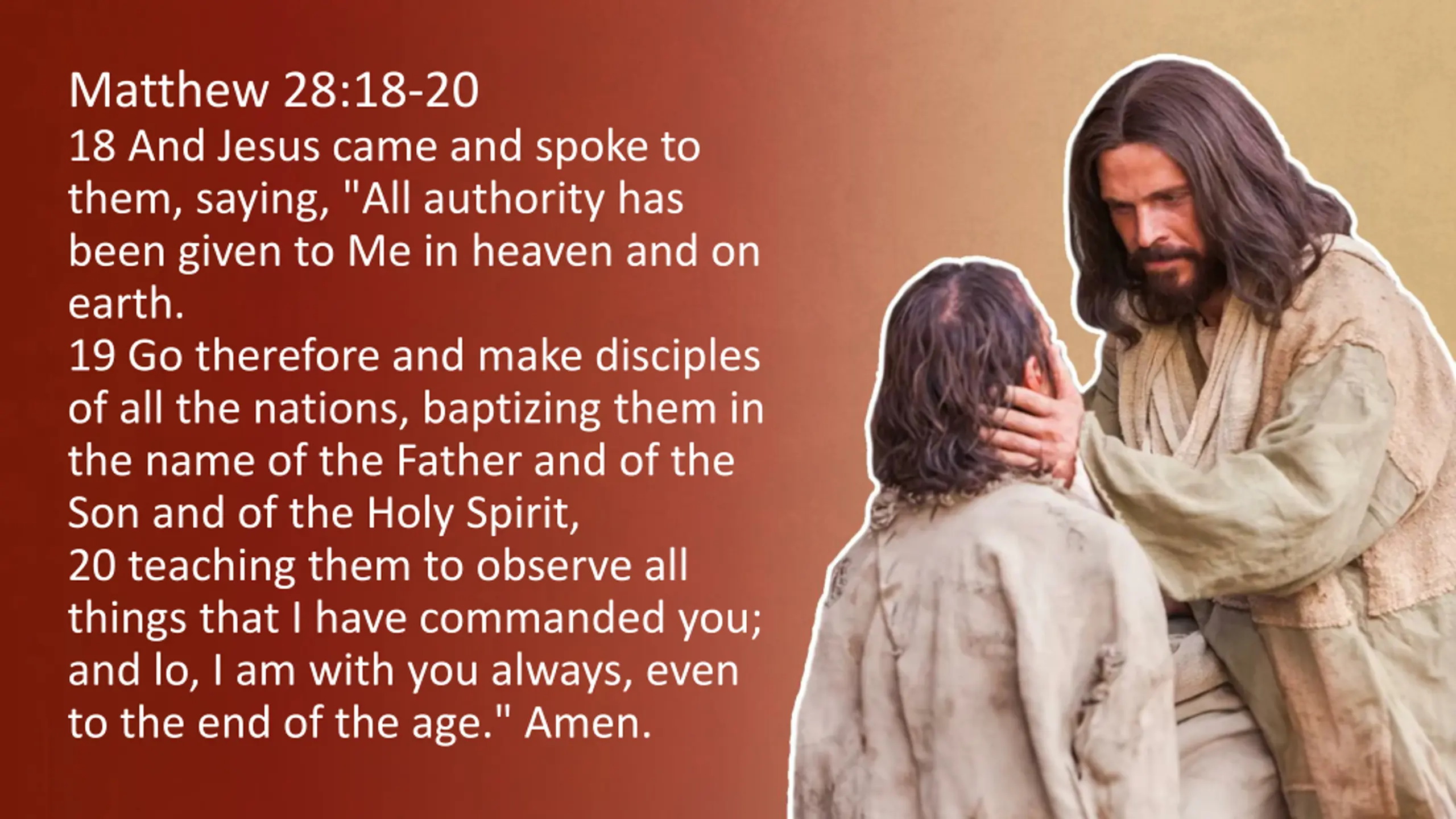 Matthew 28:18-20 18 And Jesus came and spoke to them, saying, "All authority has been given to Me in heaven and on earth. 19 Go therefore and make disciples of all the nations, baptizing them in the name of the Father and of the Son and of the Holy Spirit, 20 teaching them to observe all things that I have commanded you; and lo, I am with you always, even to the end of the age." Amen.