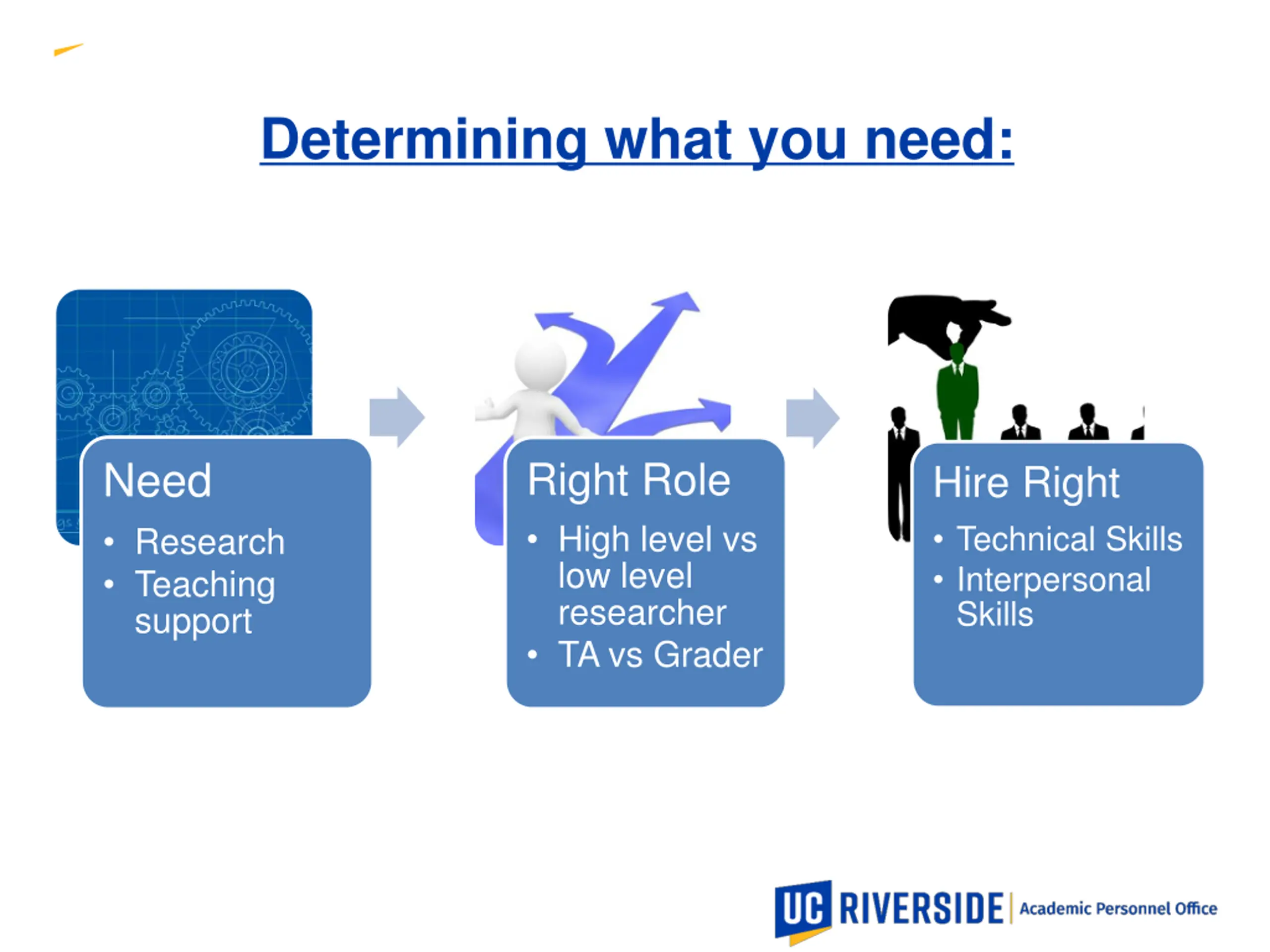 Academic Personnel Office Determining what you need: Need Research Teaching support Right Role High level vs low level researcher TA vs Grader Hire Right Technical Skills Interpersonal Skills