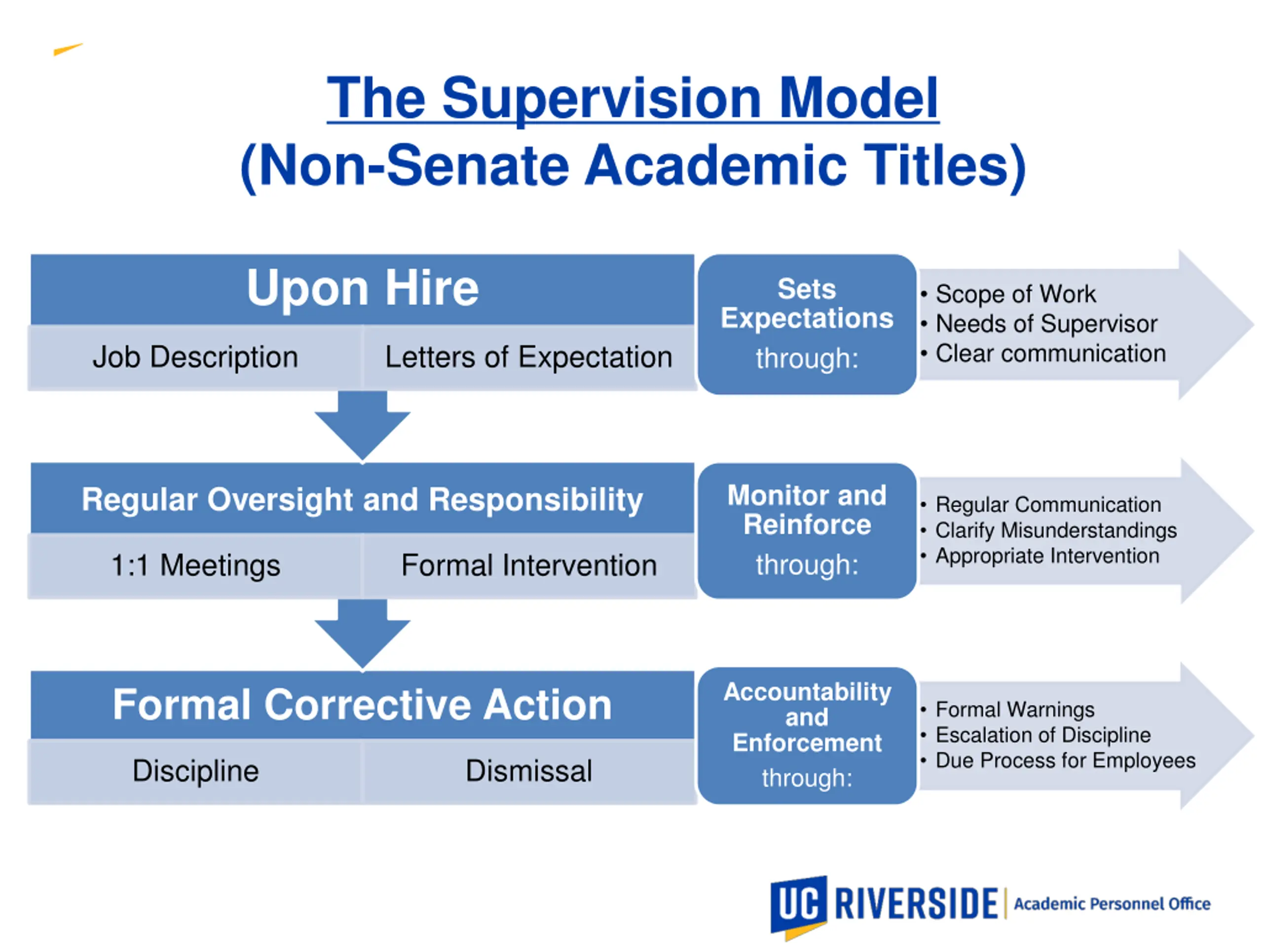 Academic Personnel Office The Supervision Model (Non-Senate Academic Titles) Upon Hire Sets Scope of Work Needs of Supervisor Clear communication Expectations through: Job Description Letters of Expectation Monitor and Reinforce through: Regular Oversight and Responsibility Regular Communication Clarify Misunderstandings Appropriate Intervention 1:1 Meetings Formal Intervention Accountability and Enforcement through: Formal Corrective Action Formal Warnings Escalation of Discipline Due Process for Employees Discipline Dismissal