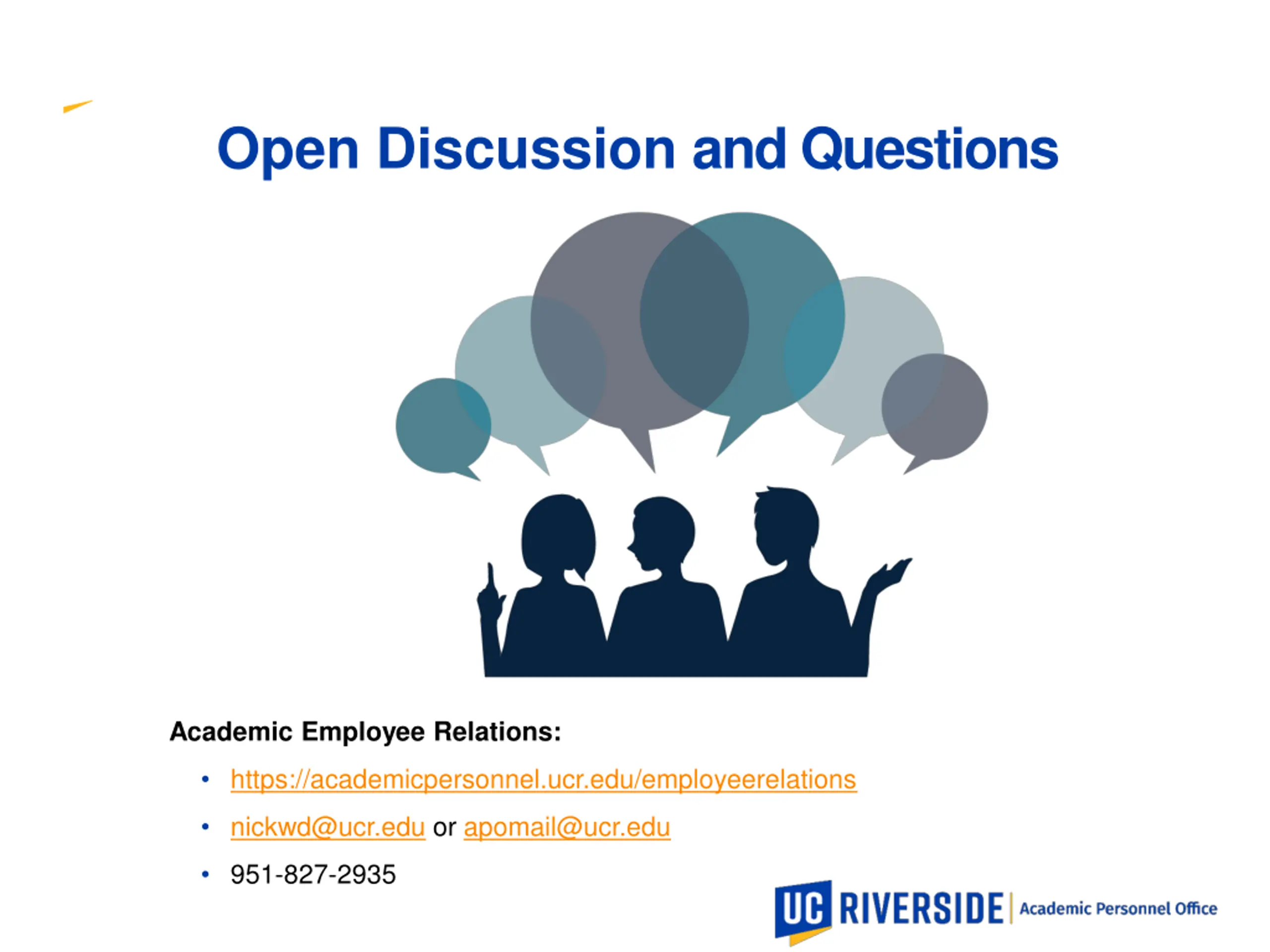 Academic Personnel Office Open Discussion and Questions Academic Employee Relations: https://academicpersonnel.ucr.edu/employeerelations nickwd@ucr.edu or apomail@ucr.edu 951-827-2935