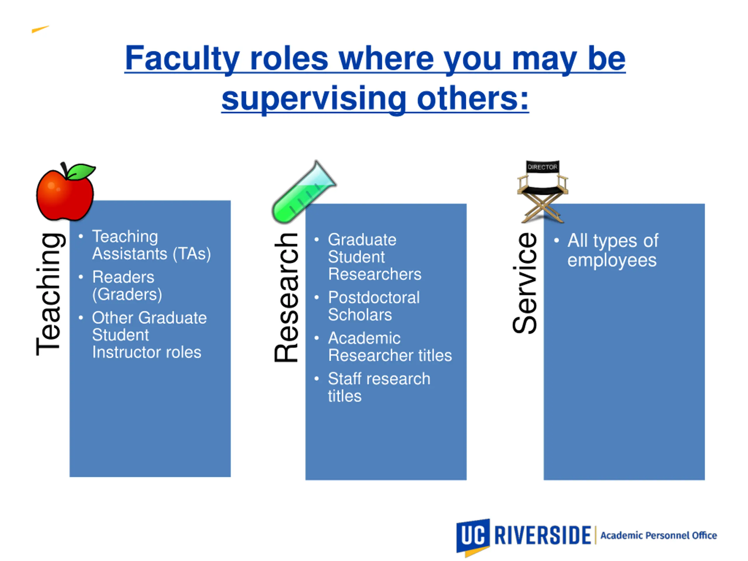 Academic Personnel Office Faculty roles where you may be supervising others: Teaching Assistants (TAs) Readers (Graders) Other Graduate Student Instructor roles All types of employees Graduate Student Researchers Postdoctoral Scholars Academic Researcher titles Staff research titles Research Teaching Service