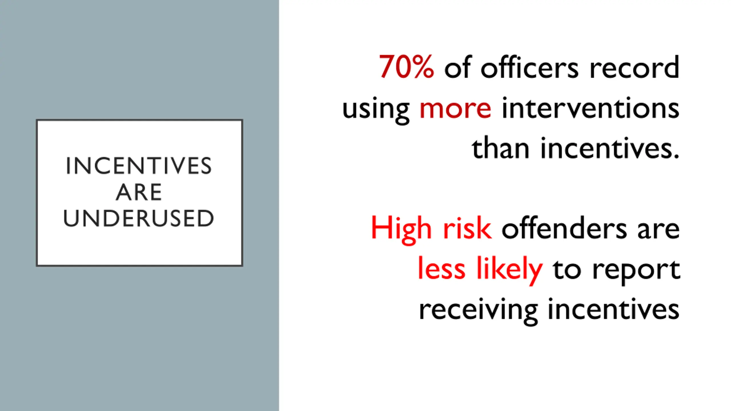 70% of officers record using more interventions than incentives. INCENTIVES ARE UNDERUSED High risk offenders are less likely to report receiving incentives