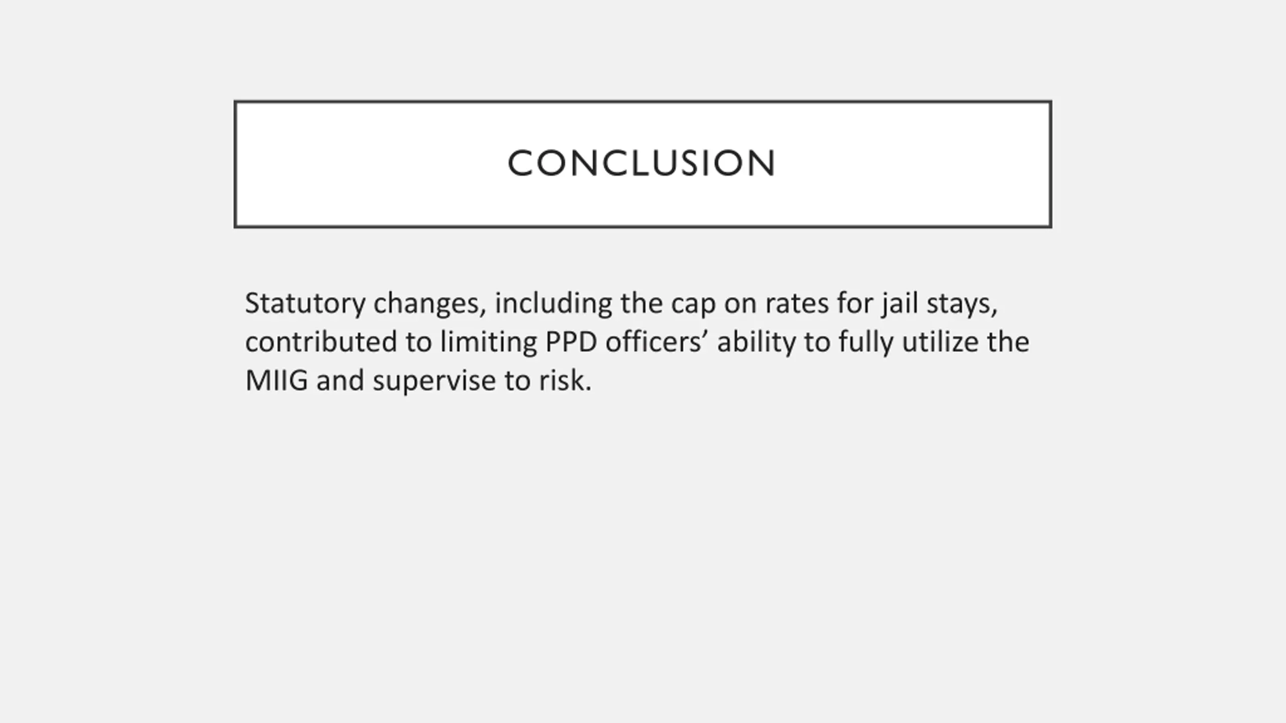 CONCLUSION Statutory changes, including the cap on rates for jail stays, contributed to limiting PPD officers ability to fully utilize the MIIG and supervise to risk.
