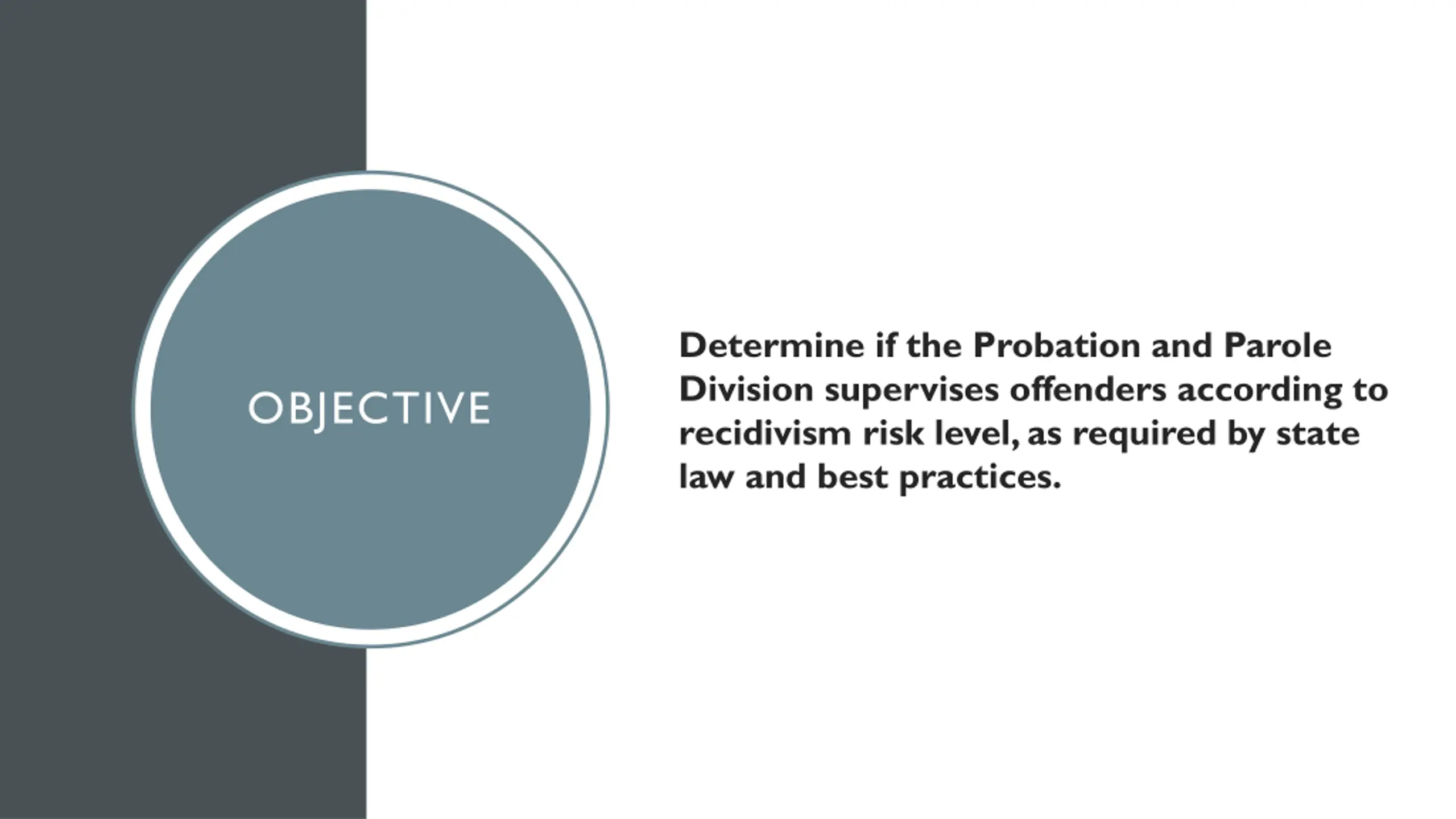 Determine if the Probation and Parole Division supervises offenders according to recidivism risk level, as required by state law and best practices. OBJECTIVE