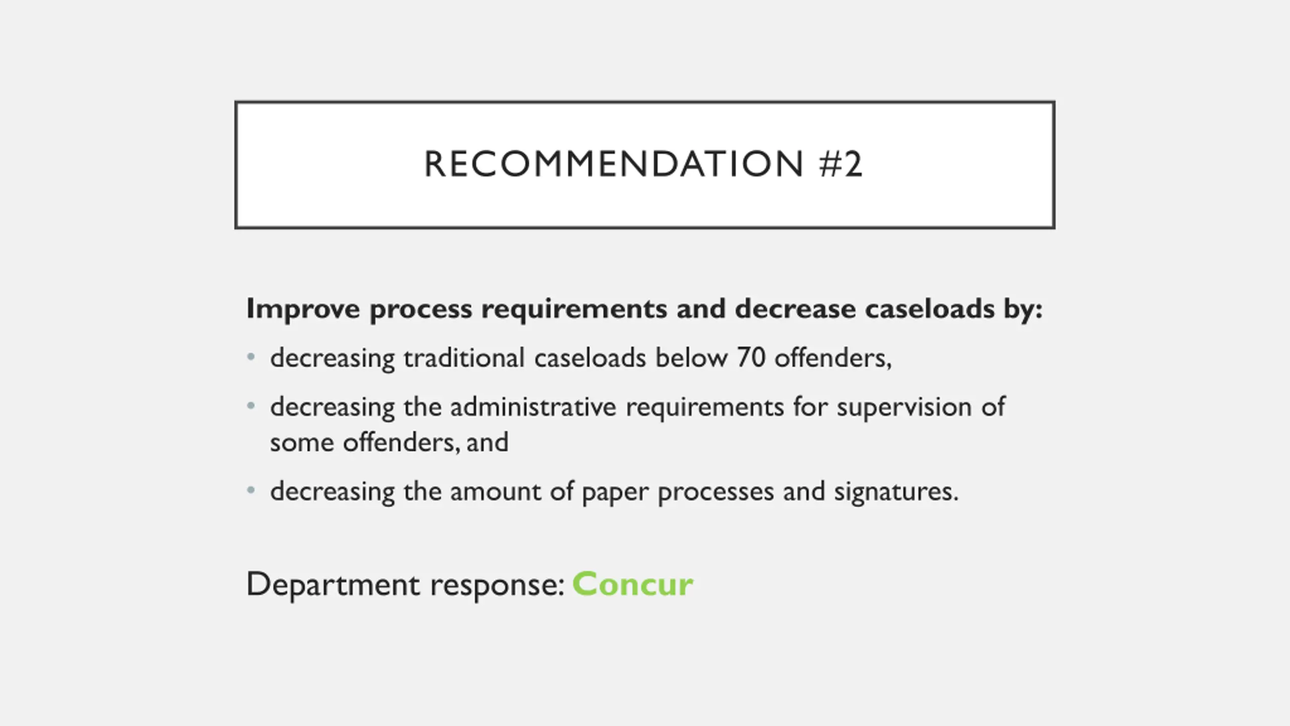 RECOMMENDATION #2 Improve process requirements and decrease caseloads by: decreasing traditional caseloads below 70 offenders, decreasing the administrative requirements for supervision of some offenders, and decreasing the amount of paper processes and signatures. Department response: Concur