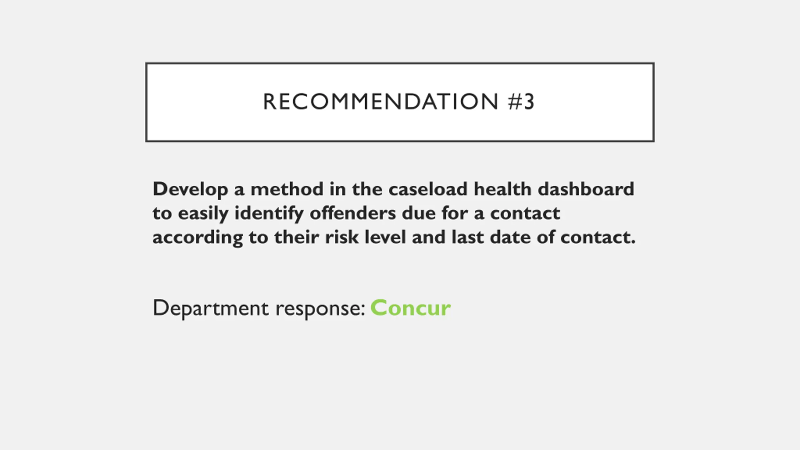 RECOMMENDATION #3 Develop a method in the caseload health dashboard to easily identify offenders due for a contact according to their risk level and last date of contact. Department response: Concur