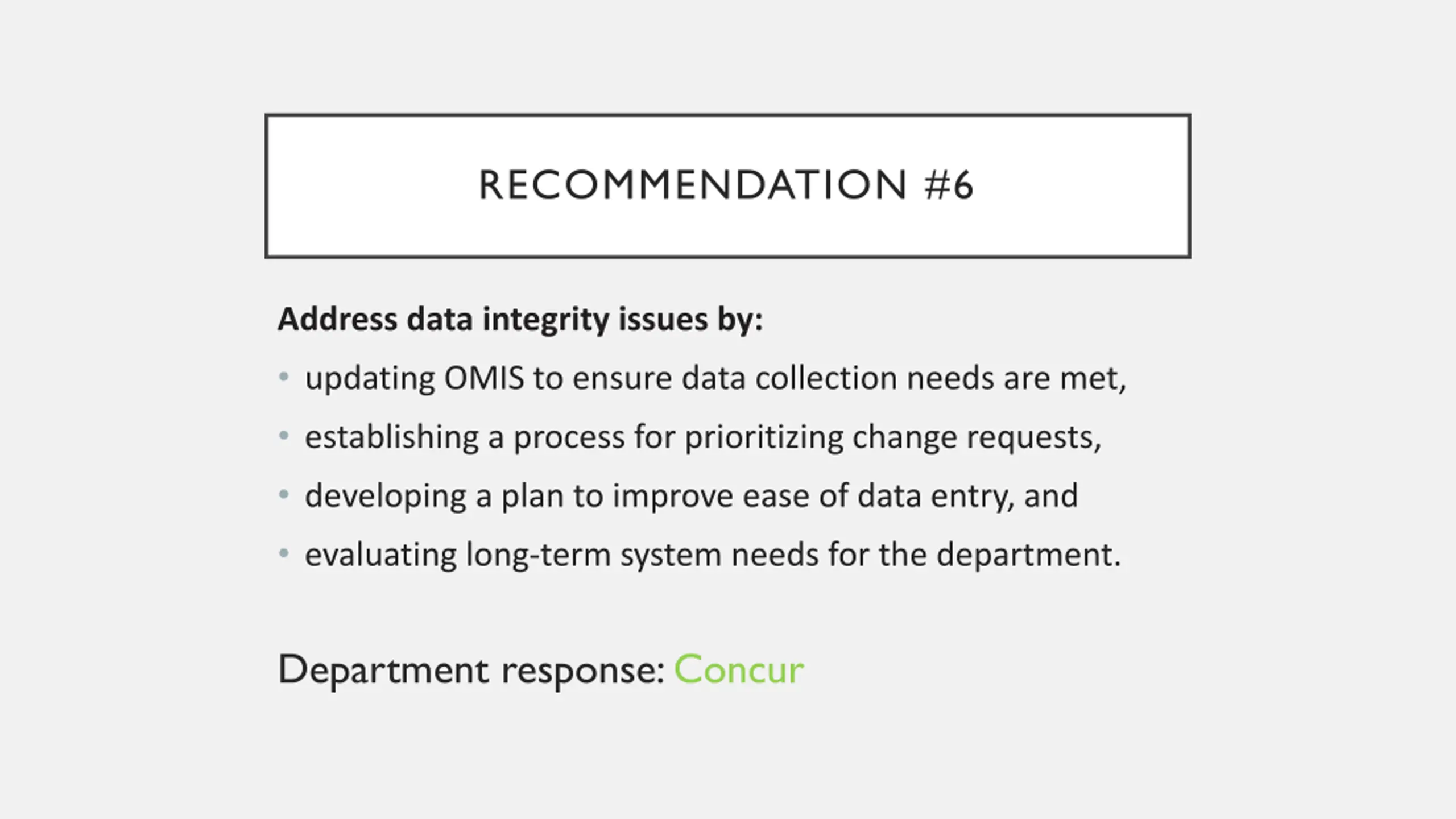 RECOMMENDATION #6 Address data integrity issues by: updating OMIS to ensure data collection needs are met, establishing a process for prioritizing change requests, developing a plan to improve ease of data entry, and evaluating long-term system needs for the department. Department response: Concur
