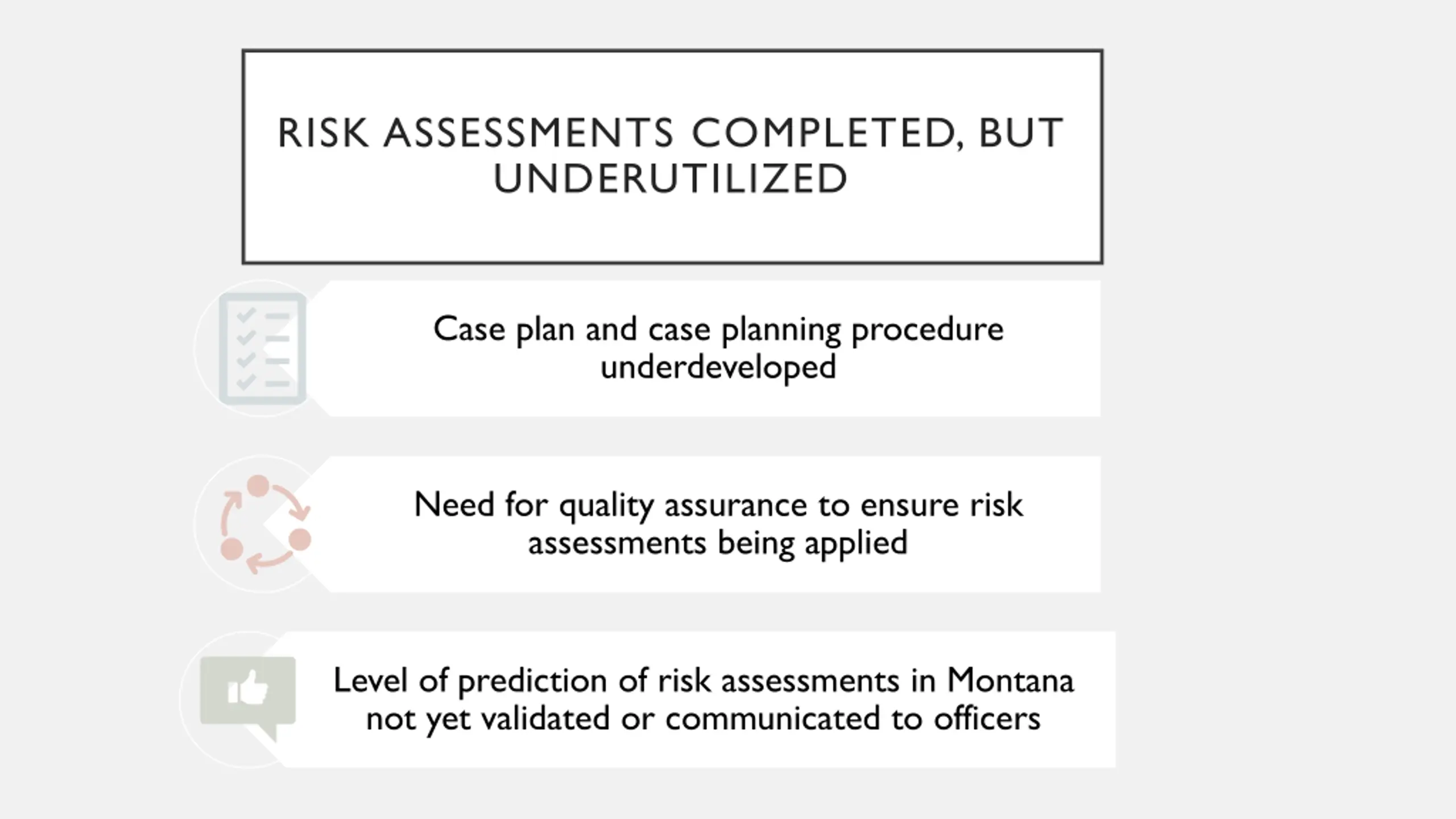 RISK ASSESSMENTS COMPLETED, BUT UNDERUTILIZED Case plan and case planning procedure underdeveloped Need for quality assurance to ensure risk assessments being applied Level of prediction of risk assessments in Montana not yet validated or communicated to officers