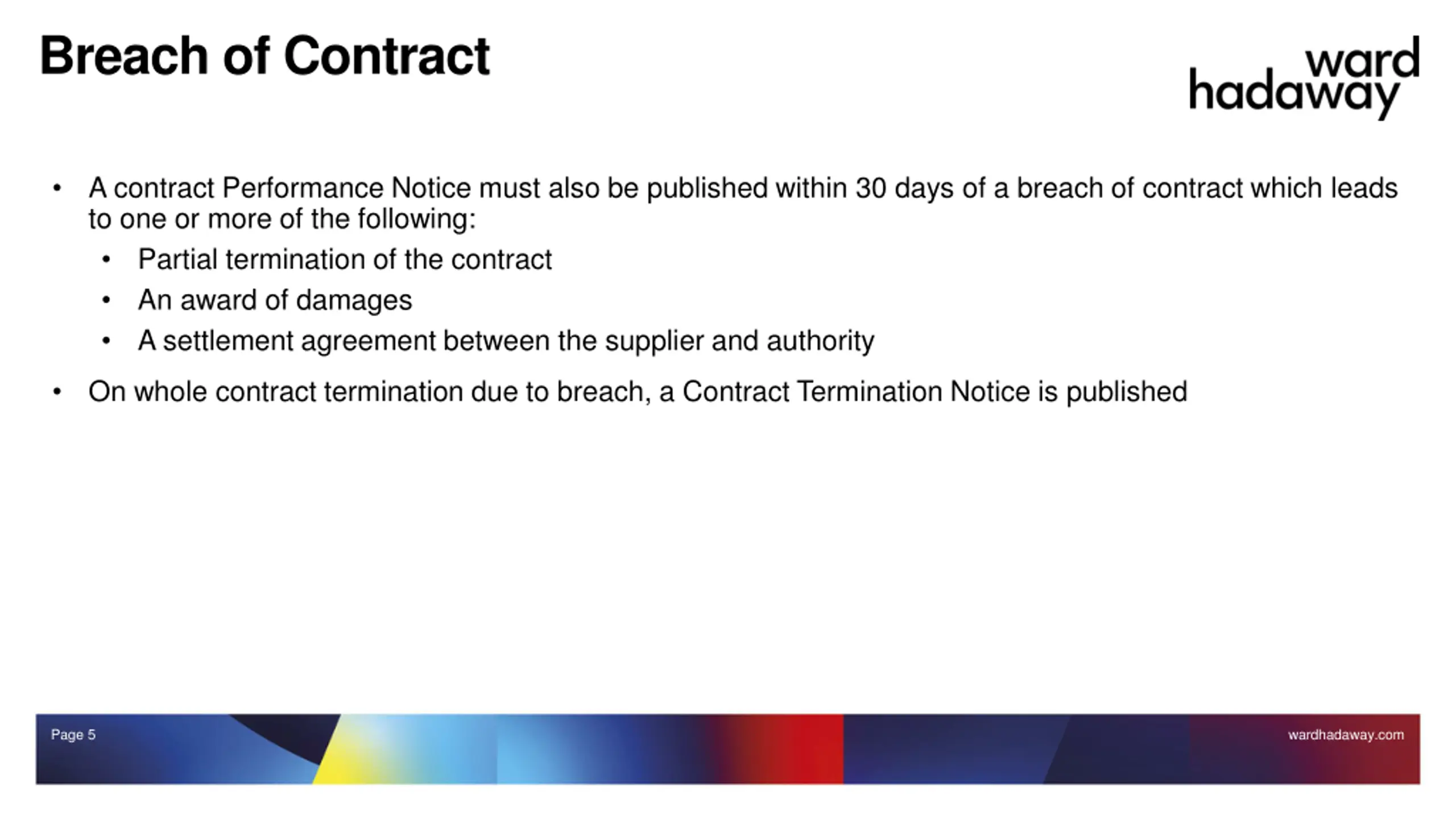 Breach of Contract A contract Performance Notice must also be published within 30 days of a breach of contract which leads to one or more of the following: Partial termination of the contract An award of damages A settlement agreement between the supplier and authority On whole contract termination due to breach, a Contract Termination Notice is published Page 5 wardhadaway.com