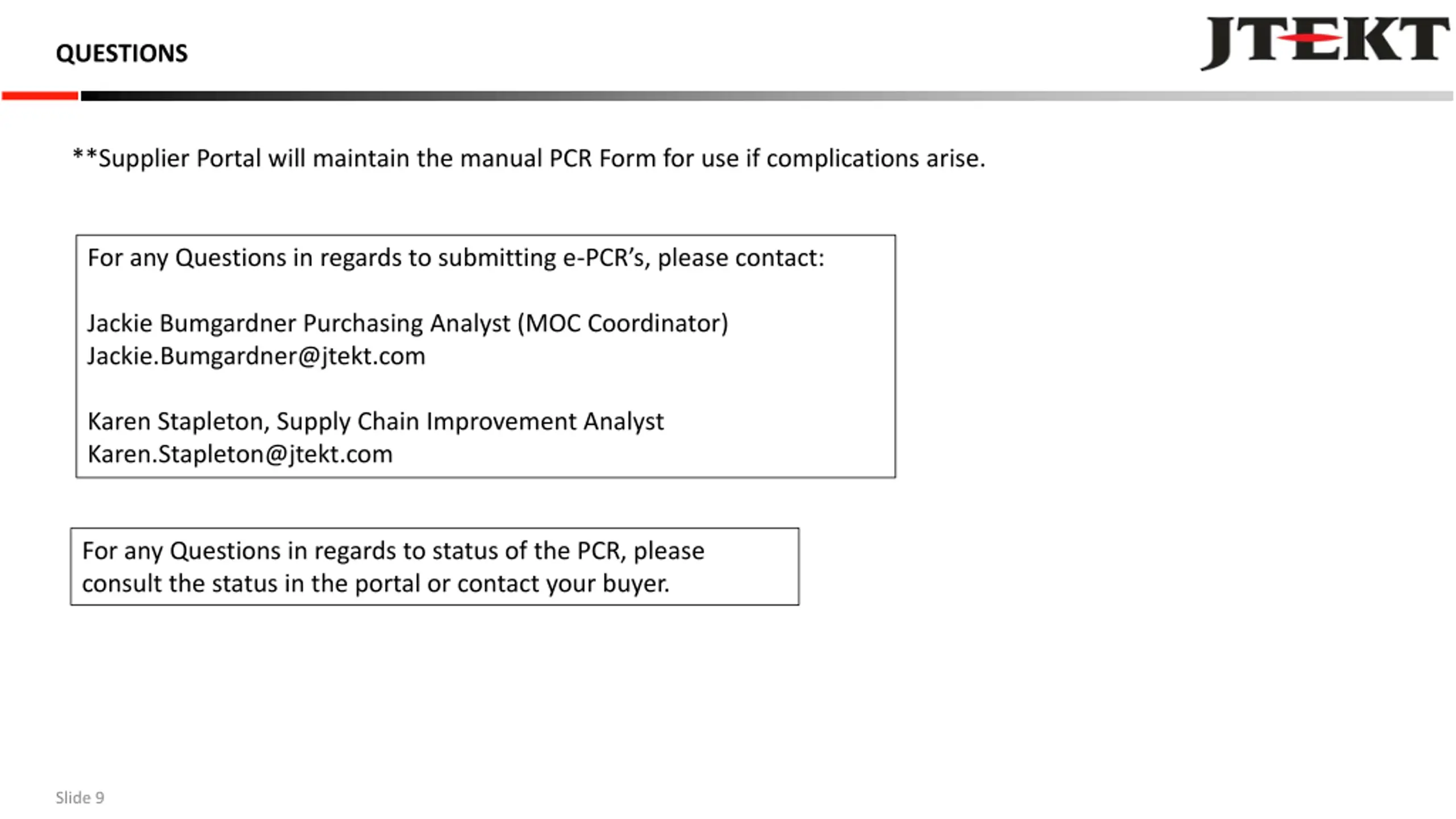 QUESTIONS **Supplier Portal will maintain the manual PCR Form for use if complications arise. For any Questions in regards to submitting e-PCR s, please contact: Jackie Bumgardner Purchasing Analyst (MOC Coordinator) Jackie.Bumgardner@jtekt.com Karen Stapleton, Supply Chain Improvement Analyst Karen.Stapleton@jtekt.com For any Questions in regards to status of the PCR, please consult the status in the portal or contact your buyer. Slide 9