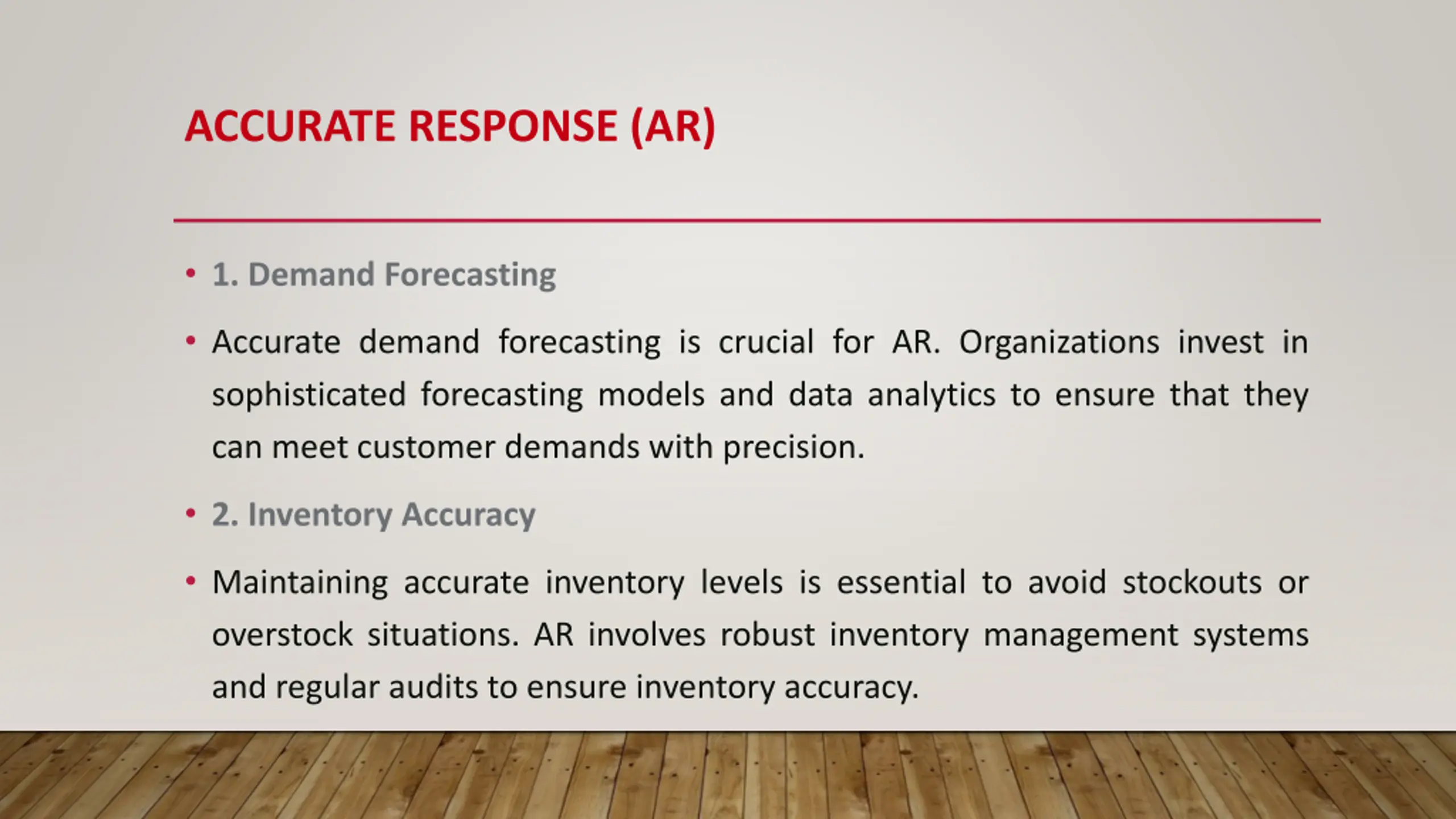 ACCURATE RESPONSE (AR) 1. Demand Forecasting Accurate demand forecasting is crucial for AR. Organizations invest in sophisticated forecasting models and data analytics to ensure that they can meet customer demands with precision. 2. Inventory Accuracy Maintaining accurate inventory levels is essential to avoid stockouts or overstock situations. AR involves robust inventory management systems and regular audits to ensure inventory accuracy.