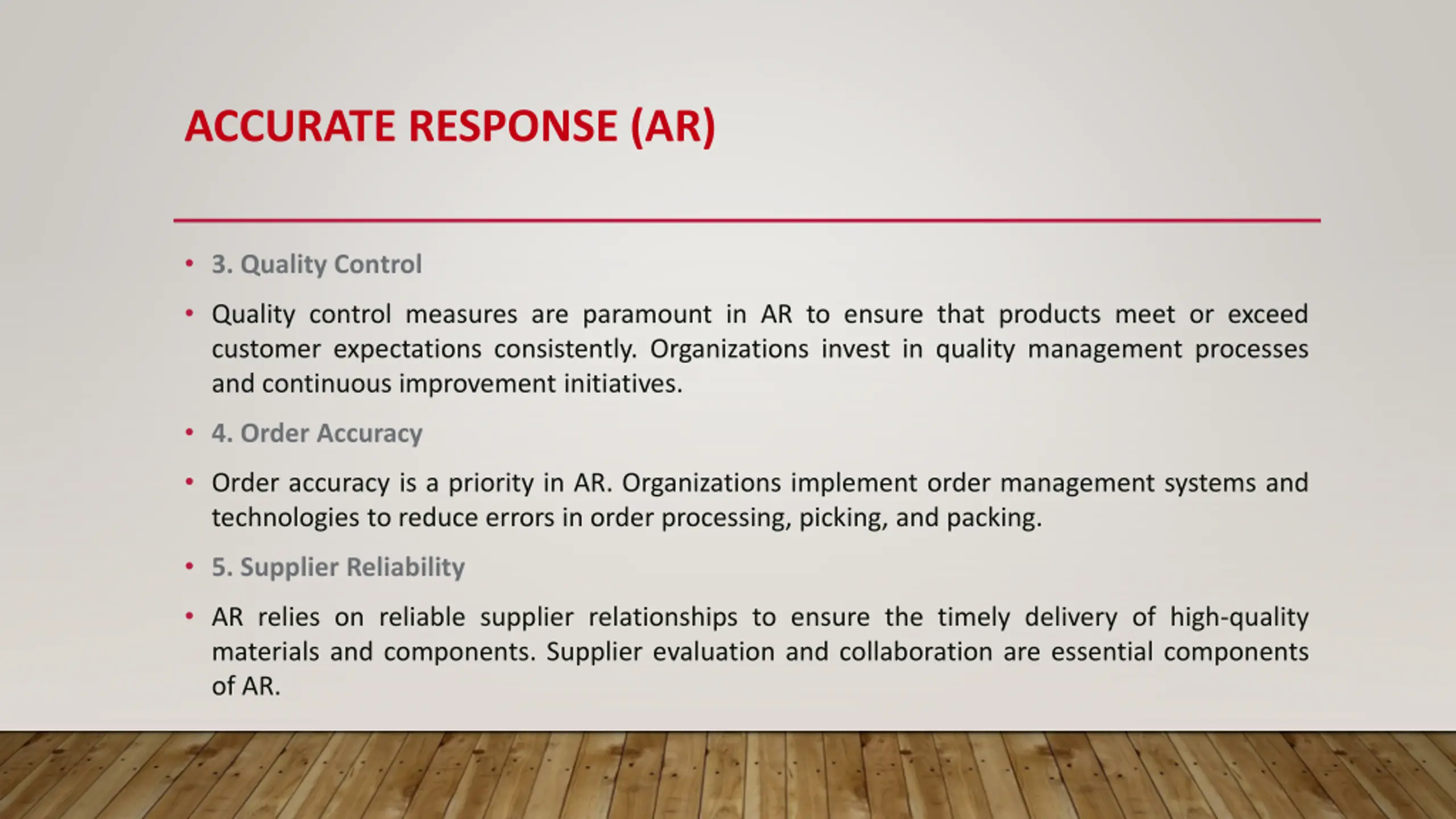 ACCURATE RESPONSE (AR) 3. Quality Control Quality control measures are paramount in AR to ensure that products meet or exceed customer expectations consistently. Organizations invest in quality management processes and continuous improvement initiatives. 4. Order Accuracy Order accuracy is a priority in AR. Organizations implement order management systems and technologies to reduce errors in order processing, picking, and packing. 5. Supplier Reliability AR relies on reliable supplier relationships to ensure the timely delivery of high-quality materials and components. Supplier evaluation and collaboration are essential components of AR.