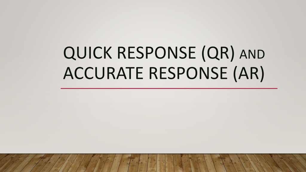 ACCURATE RESPONSE (AR) Accurate Response (AR) complements QR by emphasizing the precision and accuracy of supply chain operations. While QR focuses on speed, AR emphasizes the importance of delivering the right products in the right quantities at the right time. Key components of AR include: 1. Demand Forecasting 2. Inventory Accuracy 3. Quality Control 4. Order Accuracy 5. Supplier Reliability