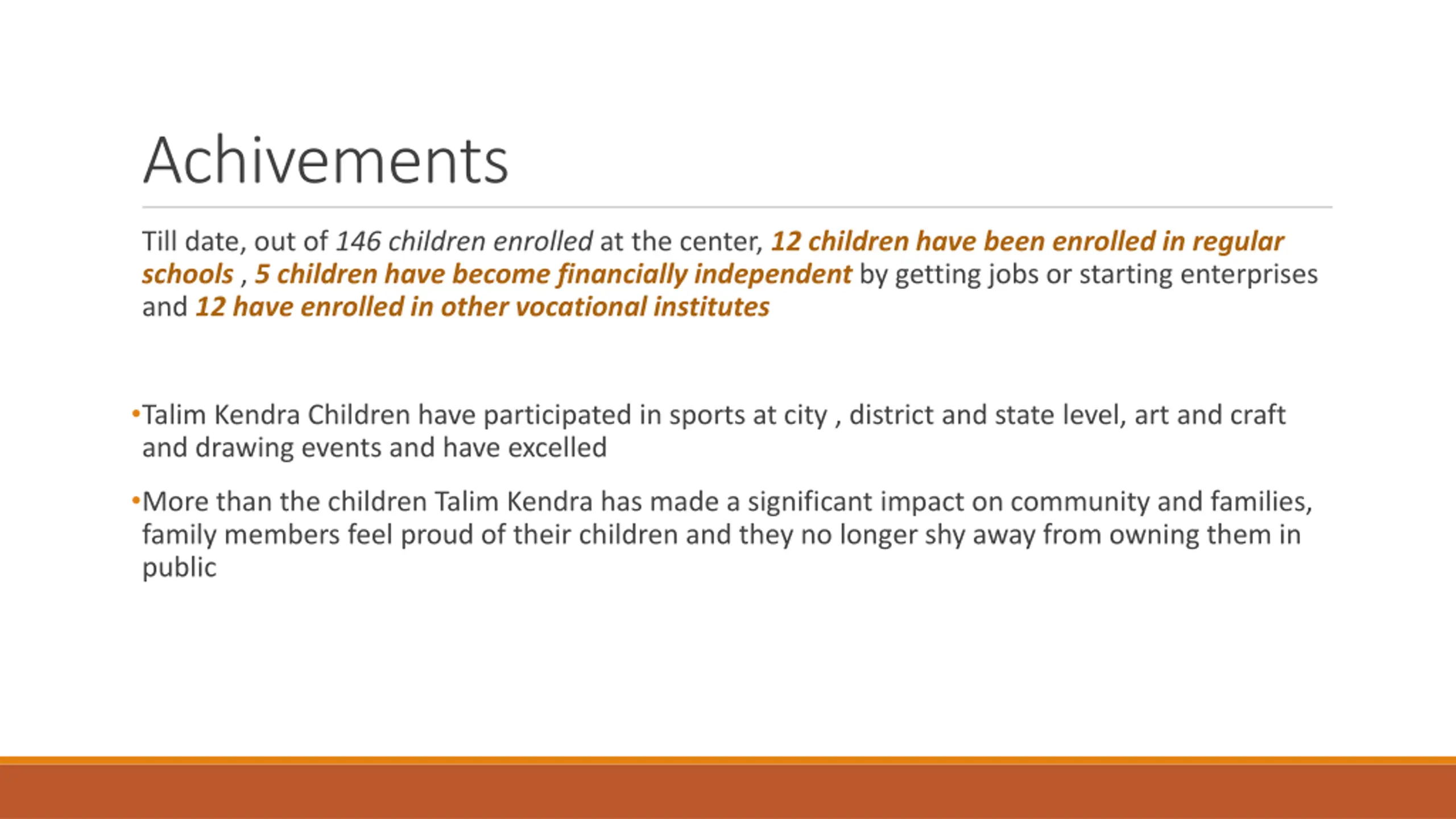 Achivements Till date, out of 146 children enrolled at the center, 12 children have been enrolled in regular schools , 5 children have become financially independent by getting jobs or starting enterprises and 12 have enrolled in other vocational institutes Talim Kendra Children have participated in sports at city , district and state level, art and craft and drawing events and have excelled More than the children Talim Kendra has made a significant impact on community and families, family members feel proud of their children and they no longer shy away from owning them in public