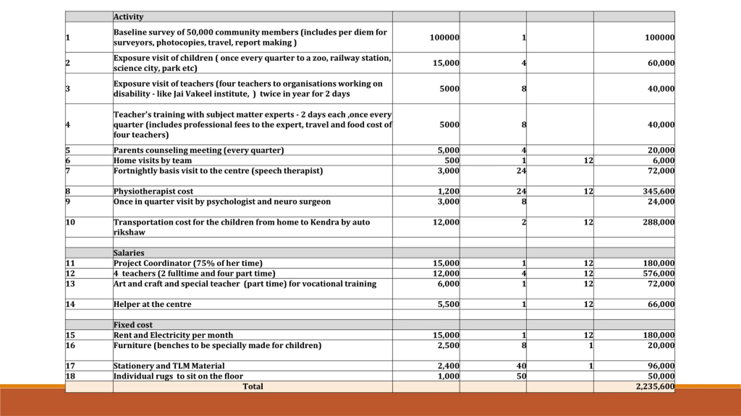 Activity Baseline survey of 50,000 community members (includes per diem for surveyors, photocopies, travel, report making ) 1 100000 1 100000 Exposure visit of children ( once every quarter to a zoo, railway station, science city, park etc) 2 15,000 4 60,000 Exposure visit of teachers (four teachers to organisationsworking on disability - like Jai Vakeel institute, ) twice in year for 2 days 3 5000 8 40,000 Teacher's training with subject matter experts - 2 days each ,once every quarter (includes professional fees to the expert, travel and food cost of four teachers) 4 5000 8 40,000 Parents counseling meeting (every quarter) Home visits by team Fortnightly basis visit to the centre (speech therapist) 5,000 500 3,000 4 1 20,000 6,000 72,000 5 6 7 12 24 8 9 Physiotherapist cost Once in quarter visit by psychologist and neuro surgeon 1,200 3,000 24 8 12 345,600 24,000 10 Transportation cost for the children from home to Kendra by auto rikshaw 12,000 2 12 288,000 Salaries Project Coordinator (75% of her time) 4 teachers (2 fulltime and four part time) Art and craft and special teacher (part time) for vocational training 11 12 13 15,000 12,000 6,000 1 4 1 12 12 12 180,000 576,000 72,000 14 Helper at the centre 5,500 1 12 66,000 Fixed cost Rent and Electricity per month Furniture (benches to be specially made for children) 15 16 15,000 2,500 1 8 12 1 180,000 20,000 17 18 Stationery and TLM Material Individual rugs to sit on the floor 2,400 1,000 40 50 1 96,000 50,000 2,235,600 Total