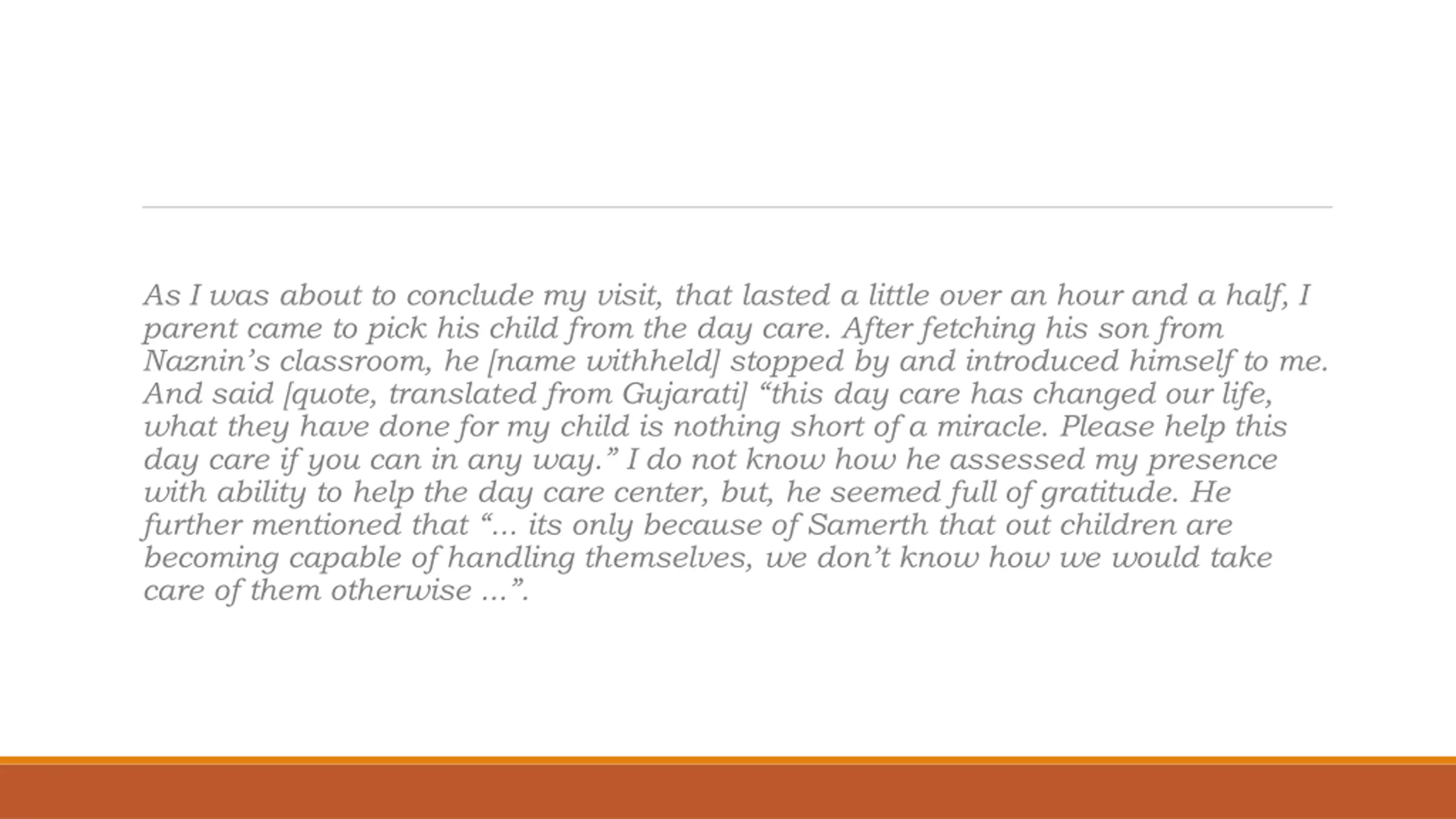 As I was about to conclude my visit, that lasted a little over an hour and a half, I parent came to pick his child from the day care. After fetching his son from Naznin s classroom, he [name withheld] stopped by and introduced himself to me. And said [quote, translated from Gujarati] this day care has changed our life, what they have done for my child is nothing short of a miracle. Please help this day care if you can in any way. I do not know how he assessed my presence with ability to help the day care center, but, he seemed full of gratitude. He further mentioned that ... its only because of Samerth that out children are becoming capable of handling themselves, we don t know how we would take care of them otherwise ... .