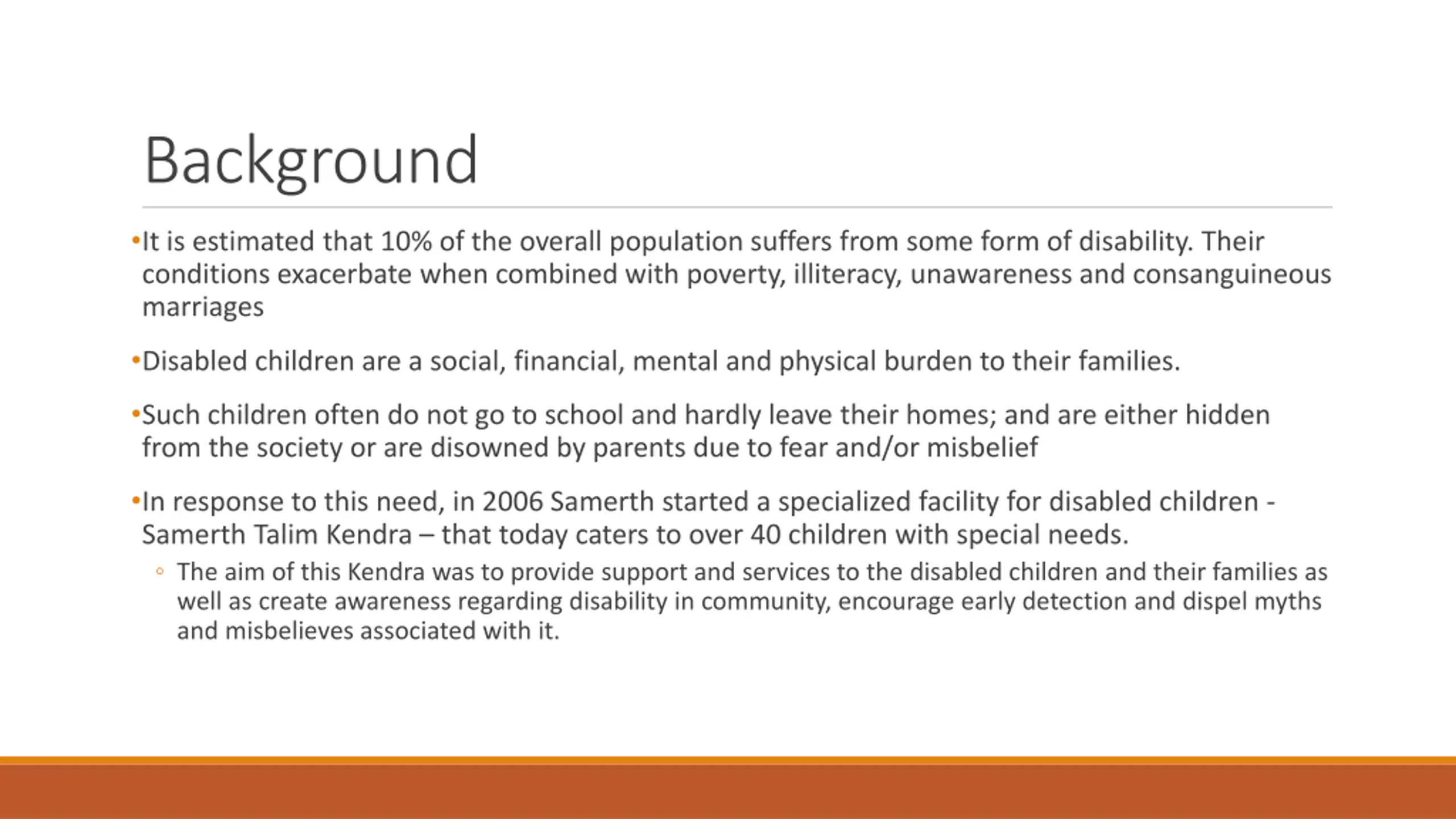 Background It is estimated that 10% of the overall population suffers from some form of disability. Their conditions exacerbate when combined with poverty, illiteracy, unawareness and consanguineous marriages Disabled children are a social, financial, mental and physical burden to their families. Such children often do not go to school and hardly leave their homes; and are either hidden from the society or are disowned by parents due to fear and/or misbelief In response to this need, in 2006 Samerth started a specialized facility for disabled children - Samerth Talim Kendra that today caters to over 40 children with special needs. The aim of this Kendra was to provide support and services to the disabled children and their families as well as create awareness regarding disability in community, encourage early detection and dispel myths and misbelieves associated with it.