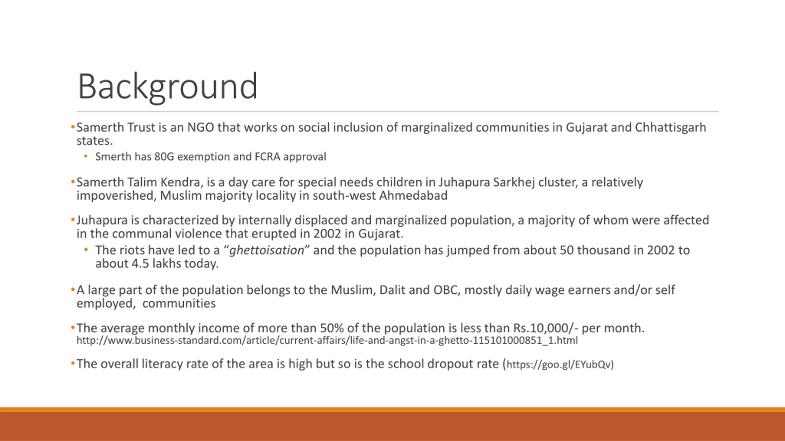 Background Samerth Trust is an NGO that works on social inclusion of marginalized communities in Gujarat and Chhattisgarh states. Smerth has 80G exemption and FCRA approval Samerth Talim Kendra, is a day care for special needs children in Juhapura Sarkhej cluster, a relatively impoverished, Muslim majority locality in south-west Ahmedabad Juhapura is characterized by internally displaced and marginalized population, a majority of whom were affected in the communal violence that erupted in 2002 in Gujarat. The riots have led to a ghettoisation and the population has jumped from about 50 thousand in 2002 to about 4.5 lakhs today. A large part of the population belongs to the Muslim, Dalit and OBC, mostly daily wage earners and/or self employed, communities The average monthly income of more than 50% of the population is less than Rs.10,000/- per month. http://www.business-standard.com/article/current-affairs/life-and-angst-in-a-ghetto-115101000851_1.html The overall literacy rate of the area is high but so is the school dropout rate (https://goo.gl/EYubQv)