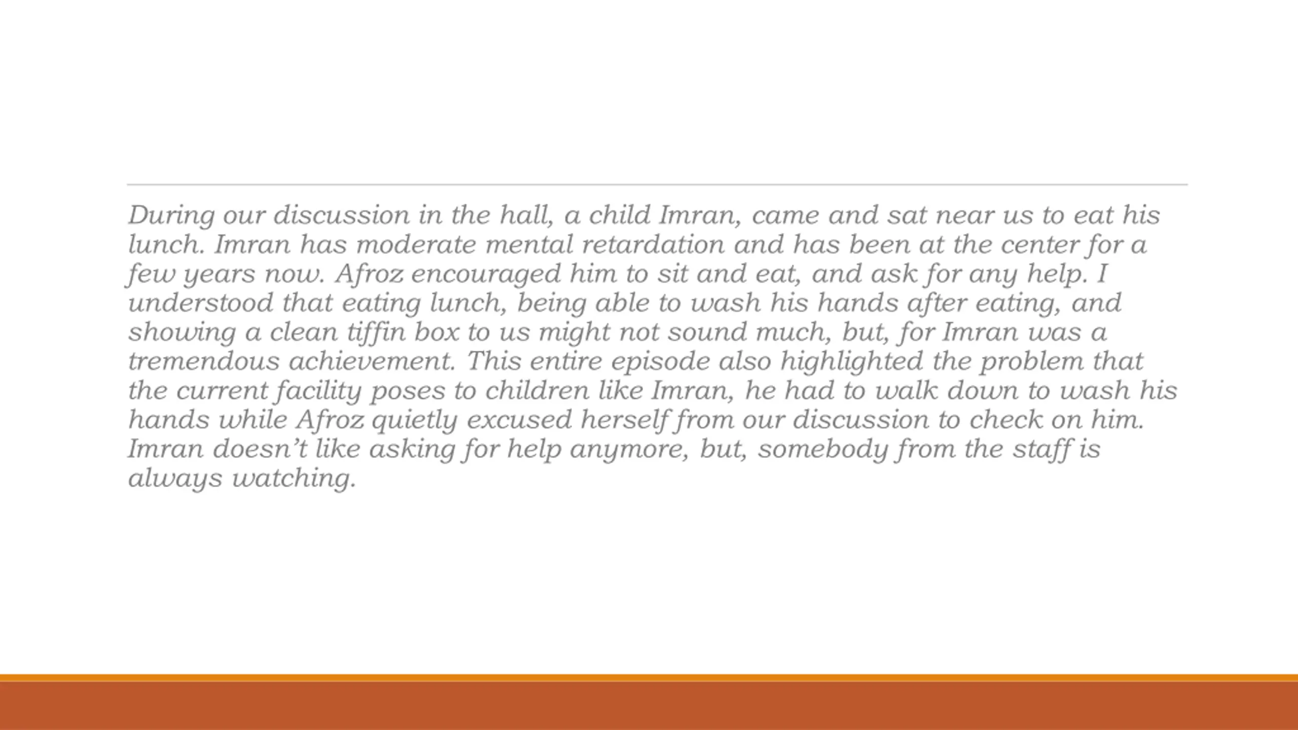 During our discussion in the hall, a child Imran, came and sat near us to eat his lunch. Imran has moderate mental retardation and has been at the center for a few years now. Afroz encouraged him to sit and eat, and ask for any help. I understood that eating lunch, being able to wash his hands after eating, and showing a clean tiffin box to us might not sound much, but, for Imran was a tremendous achievement. This entire episode also highlighted the problem that the current facility poses to children like Imran, he had to walk down to wash his hands while Afroz quietly excused herself from our discussion to check on him. Imran doesn t like asking for help anymore, but, somebody from the staff is always watching.