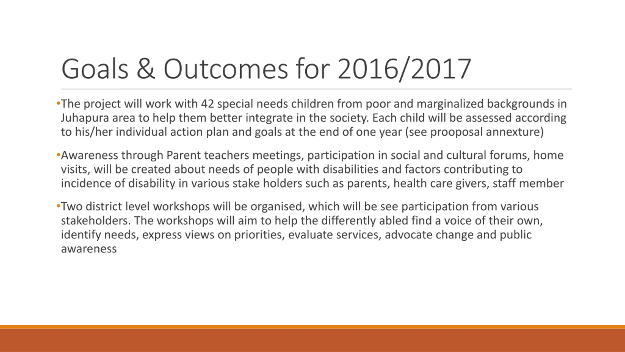 Goals & Outcomes for 2016/2017 The project will work with 42 special needs children from poor and marginalized backgrounds in Juhapura area to help them better integrate in the society. Each child will be assessed according to his/her individual action plan and goals at the end of one year (see prooposal annexture) Awareness through Parent teachers meetings, participation in social and cultural forums, home visits, will be created about needs of people with disabilities and factors contributing to incidence of disability in various stake holders such as parents, health care givers, staff member Two district level workshops will be organised, which will be see participation from various stakeholders. The workshops will aim to help the differently abled find a voice of their own, identify needs, express views on priorities, evaluate services, advocate change and public awareness