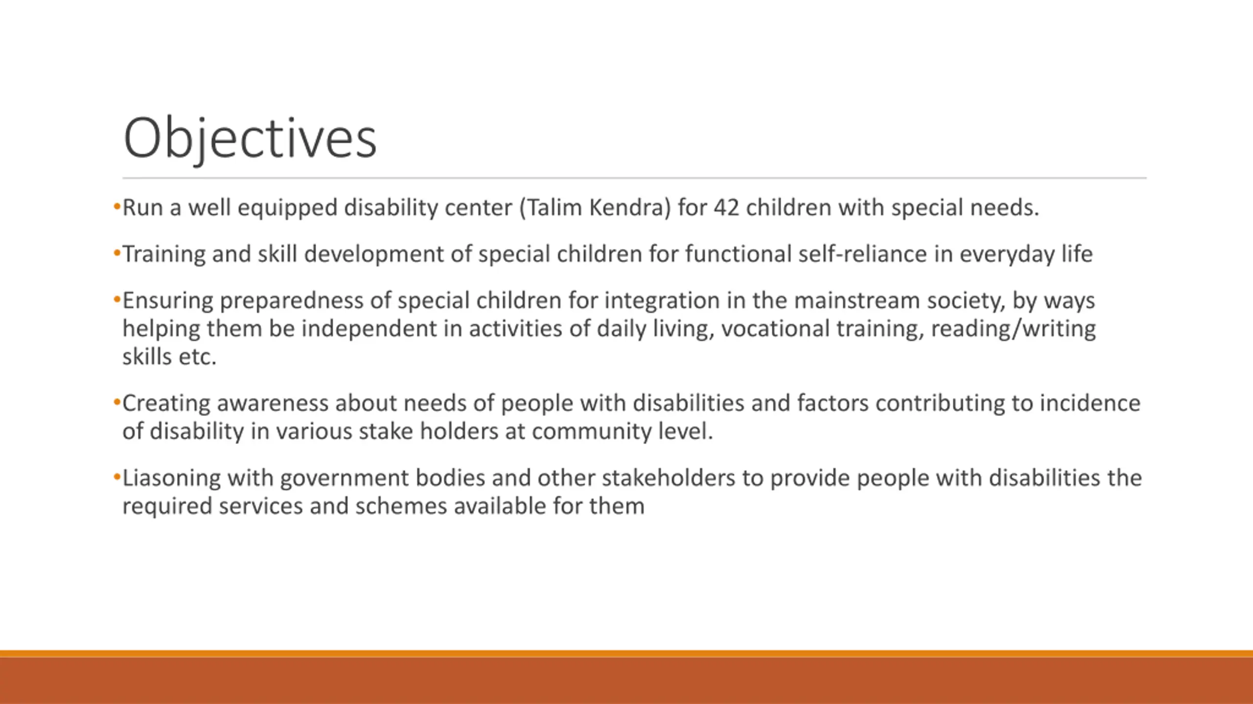 Objectives Run a well equipped disability center (Talim Kendra) for 42 children with special needs. Training and skill development of special children for functional self-reliance in everyday life Ensuring preparedness of special children for integration in the mainstream society, by ways helping them be independent in activities of daily living, vocational training, reading/writing skills etc. Creating awareness about needs of people with disabilities and factors contributing to incidence of disability in various stake holders at community level. Liasoning with government bodies and other stakeholders to provide people with disabilities the required services and schemes available for them