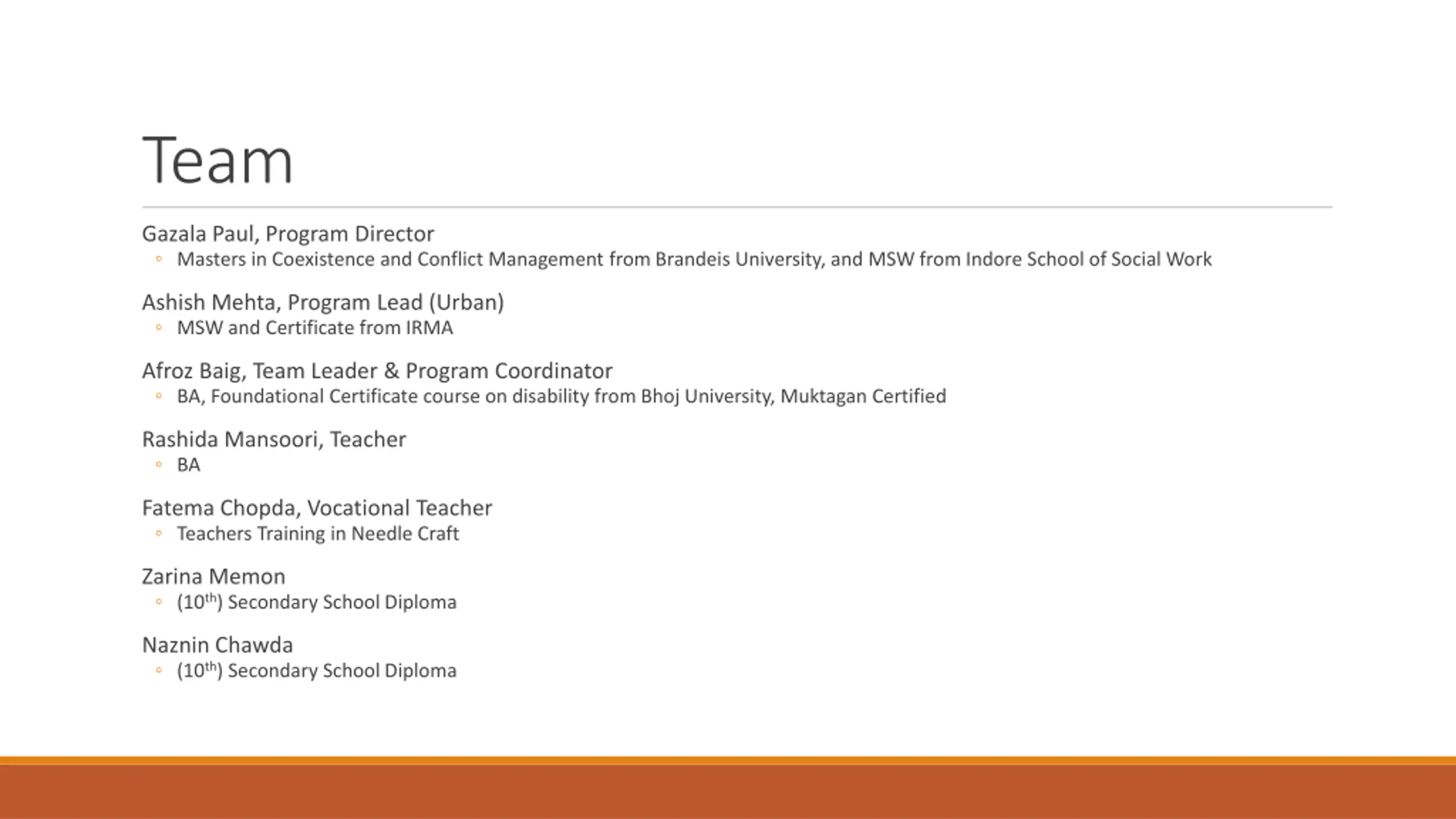Team Gazala Paul, Program Director Masters in Coexistence and Conflict Management from Brandeis University, and MSW from Indore School of Social Work Ashish Mehta, Program Lead (Urban) MSW and Certificate from IRMA Afroz Baig, Team Leader & Program Coordinator BA, Foundational Certificate course on disability from Bhoj University, Muktagan Certified Rashida Mansoori, Teacher BA Fatema Chopda, Vocational Teacher Teachers Training in Needle Craft Zarina Memon (10th) Secondary School Diploma Naznin Chawda (10th) Secondary School Diploma