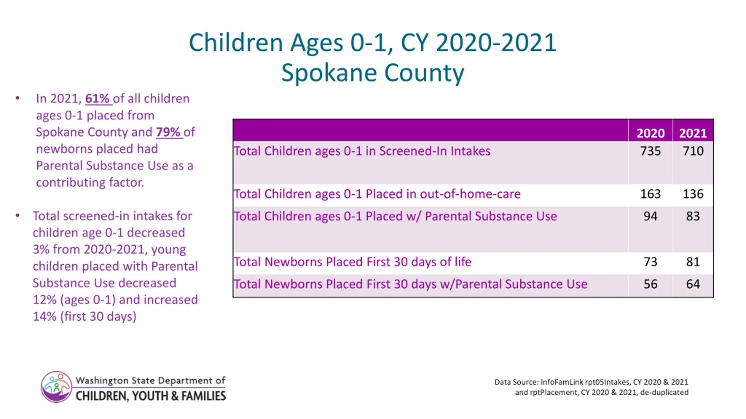 Children Ages 0-1, CY 2020-2021 Spokane County In 2021, 61% of all children ages 0-1 placed from Spokane County and 79% of newborns placed had Parental Substance Use as a contributing factor. Total Children ages 0-1 Placed in out-of-home-care 2020 735 2021 710 Total Children ages 0-1 in Screened-In Intakes 163 136 Total screened-in intakes for children age 0-1 decreased 3% from 2020-2021, young children placed with Parental Substance Use decreased 12% (ages 0-1) and increased 14% (first 30 days) Total Children ages 0-1 Placed w/ Parental Substance Use 94 83 Total Newborns Placed First 30 days of life 73 81 Total Newborns Placed First 30 days w/Parental Substance Use 56 64 Data Source: InfoFamLink rpt05Intakes, CY 2020 & 2021 and rptPlacement, CY 2020 & 2021, de-duplicated 4