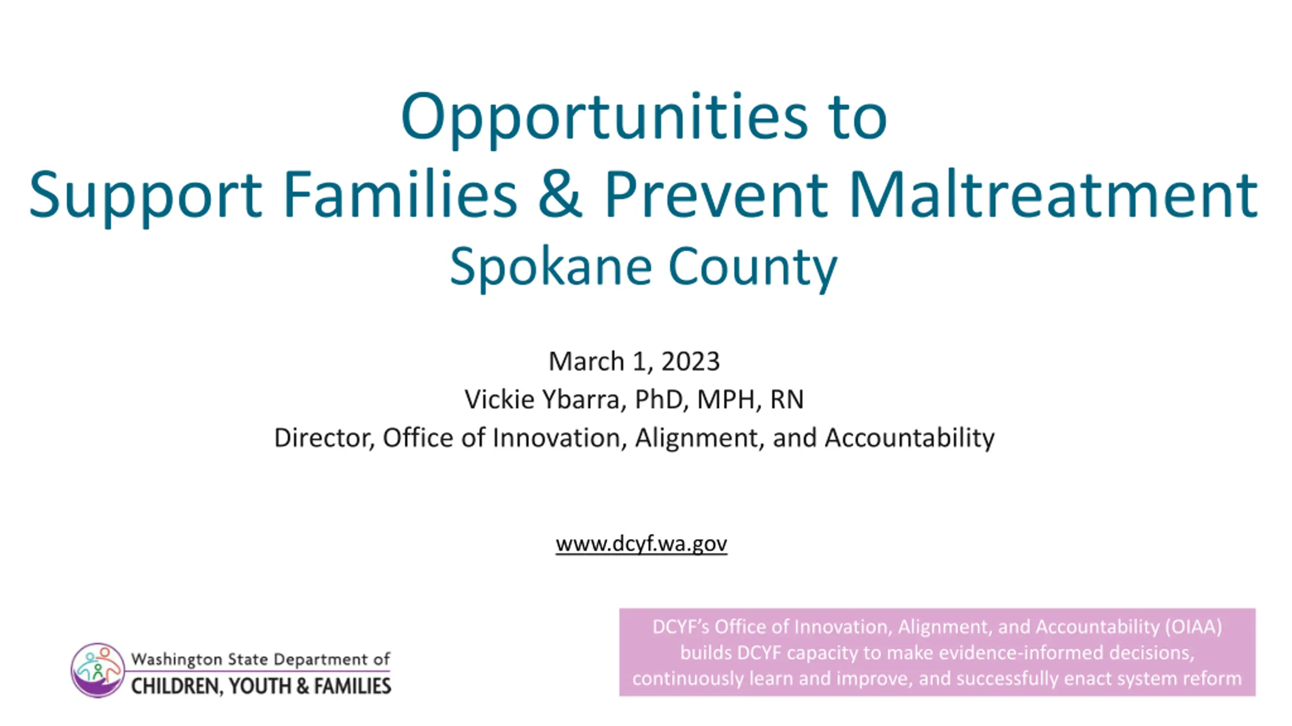 Opportunities to Support Families & Prevent Maltreatment Spokane County March 1, 2023 Vickie Ybarra, PhD, MPH, RN Director, Office of Innovation, Alignment, and Accountability www.dcyf.wa.gov www.dcyf.wa.gov DCYF s Office of Innovation, Alignment, and Accountability (OIAA) builds DCYF capacity to make evidence-informed decisions, continuously learn and improve, and successfully enact system reform 1