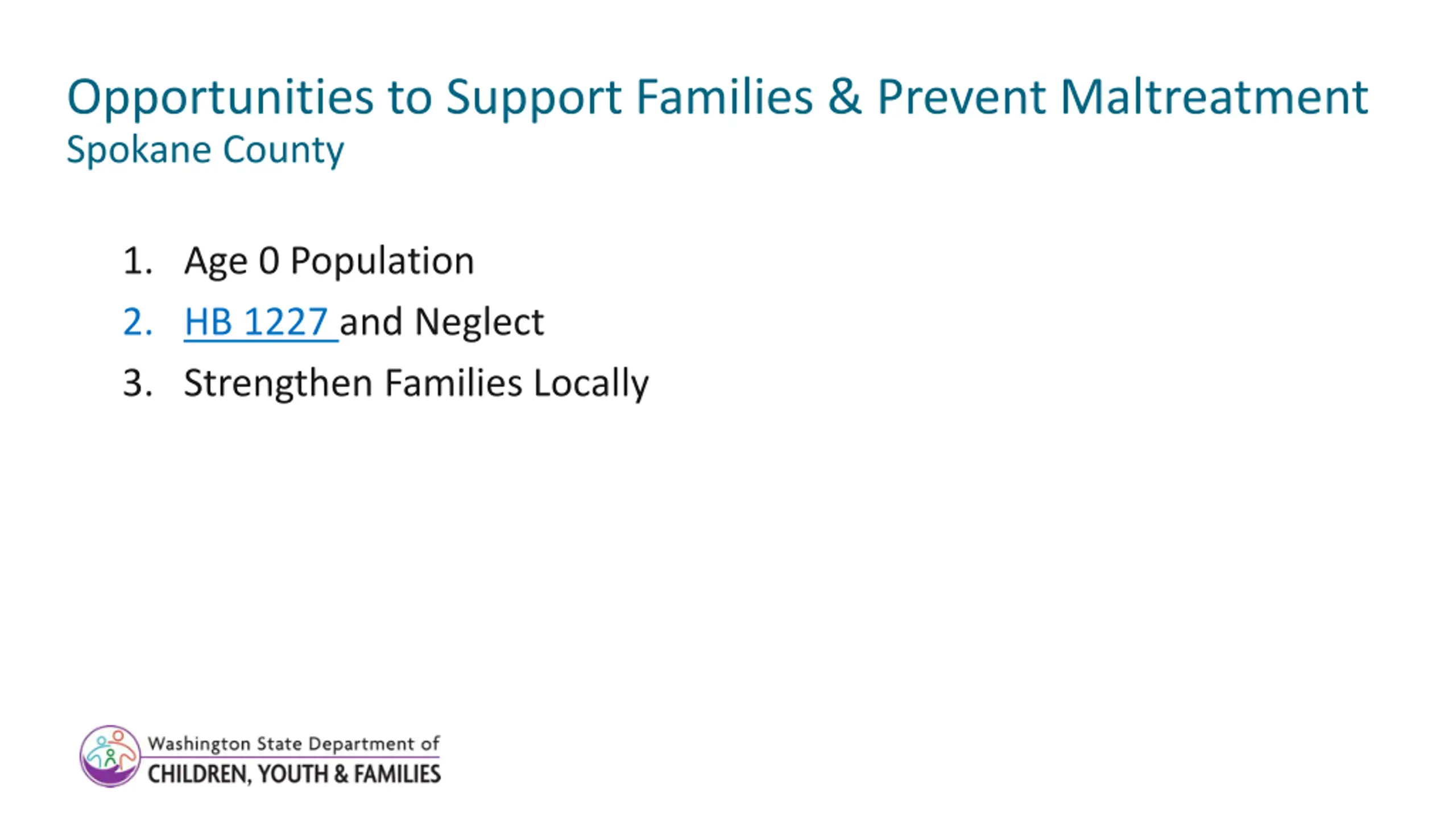 Opportunities to Support Families & Prevent Maltreatment Spokane County 1. Age 0 Population 2. HB 1227 and Neglect 3. Strengthen Families Locally 2
