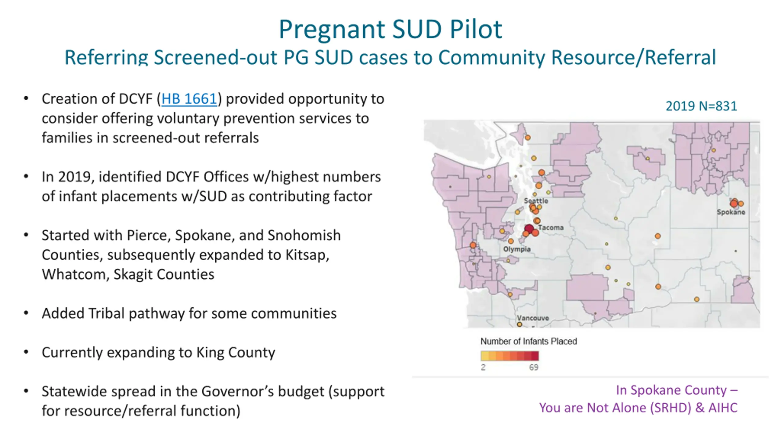 Pregnant SUD Pilot Referring Screened-out PG SUD cases to Community Resource/Referral Creation of DCYF (HB 1661) provided opportunity to consider offering voluntary prevention services to families in screened-out referrals 2019 N=831 In 2019, identified DCYF Offices w/highest numbers of infant placements w/SUD as contributing factor Started with Pierce, Spokane, and Snohomish Counties, subsequently expanded to Kitsap, Whatcom, Skagit Counties Added Tribal pathway for some communities Currently expanding to King County Statewide spread in the Governor s budget (support for resource/referral function) In Spokane County You are Not Alone (SRHD) & AIHC 6