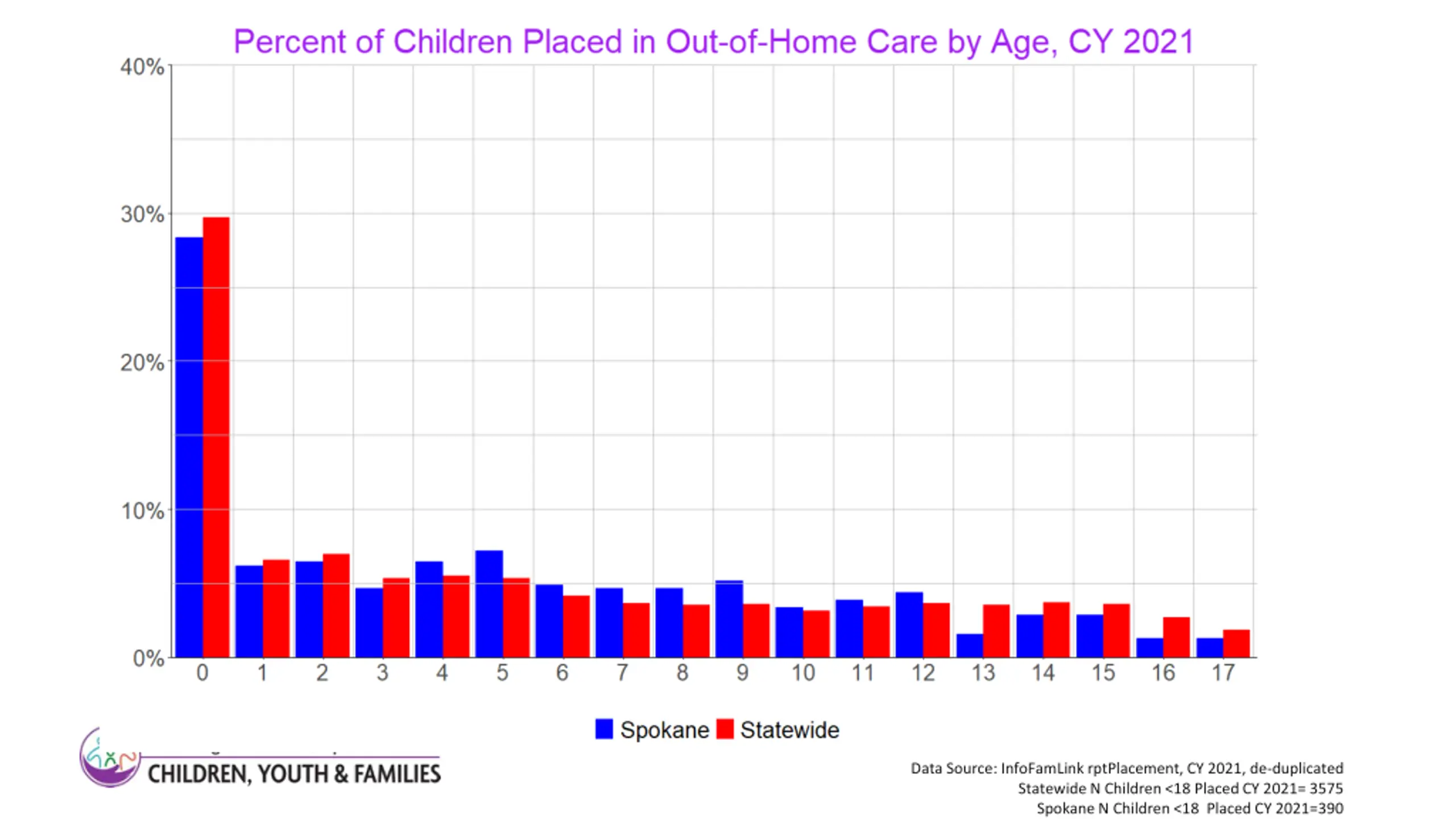 3 Data Source: InfoFamLink rptPlacement, CY 2021, de-duplicated Statewide N Children <18 Placed CY 2021= 3575 Spokane N Children <18 Placed CY 2021=390