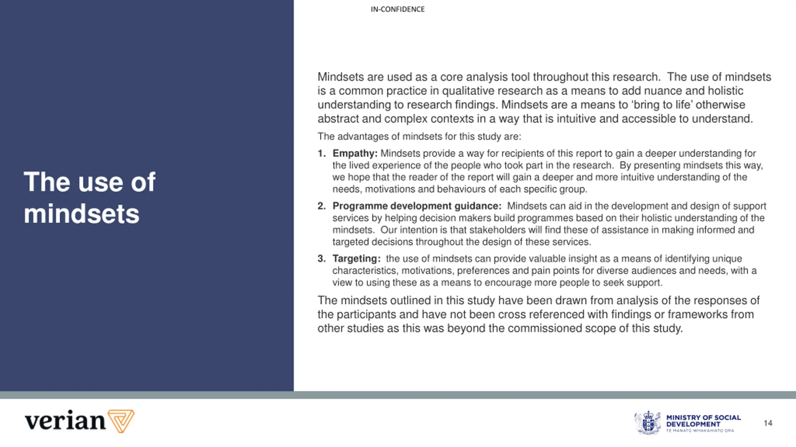 - IN-CONFIDENCE Mindsets are used as a core analysis tool throughout this research. The use of mindsets is a common practice in qualitative research as a means to add nuance and holistic understanding to research findings. Mindsets are a means to bring to life otherwise abstract and complex contexts in a way that is intuitive and accessible to understand. The advantages of mindsets for this study are: 1. Empathy: Mindsets provide a way for recipients of this report to gain a deeper understanding for the lived experience of the people who took part in the research. By presenting mindsets this way, we hope that the reader of the report will gain a deeper and more intuitive understanding of the needs, motivations and behaviours of each specific group. The use of mindsets 2. Programme development guidance: Mindsets can aid in the development and design of support services by helping decision makers build programmes based on their holistic understanding of the mindsets. Our intention is that stakeholders will find these of assistance in making informed and targeted decisions throughout the design of these services. 3. Targeting: the use of mindsets can provide valuable insight as a means of identifying unique characteristics, motivations, preferences and pain points for diverse audiences and needs, with a view to using these as a means to encourage more people to seek support. The mindsets outlined in this study have been drawn from analysis of the responses of the participants and have not been cross referenced with findings or frameworks from other studies as this was beyond the commissioned scope of this study. 14