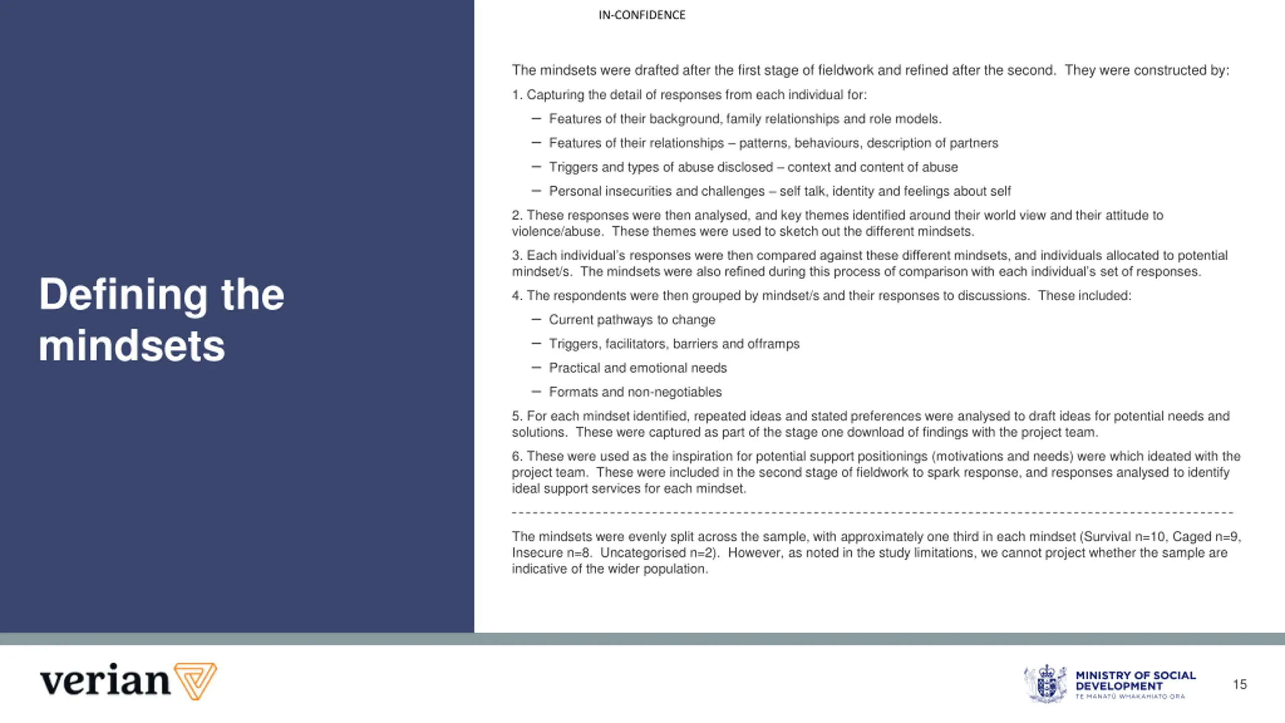 - IN-CONFIDENCE The mindsets were drafted after the first stage of fieldwork and refined after the second. They were constructed by: 1. Capturing the detail of responses from each individual for: Features of their background, family relationships and role models. Features of their relationships patterns, behaviours, description of partners Triggers and types of abuse disclosed context and content of abuse Personal insecurities and challenges self talk, identity and feelings about self 2. These responses were then analysed, and key themes identified around their world view and their attitude to violence/abuse. These themes were used to sketch out the different mindsets. 3. Each individual s responses were then compared against these different mindsets, and individuals allocated to potential mindset/s. The mindsets were also refined during this process of comparison with each individual s set of responses. Defining the mindsets 4. The respondents were then grouped by mindset/s and their responses to discussions. These included: Current pathways to change Triggers, facilitators, barriers and offramps Practical and emotional needs Formats and non-negotiables 5. For each mindset identified, repeated ideas and stated preferences were analysed to draft ideas for potential needs and solutions. These were captured as part of the stage one download of findings with the project team. 6. These were used as the inspiration for potential support positionings (motivations and needs) were which ideated with the project team. These were included in the second stage of fieldwork to spark response, and responses analysed to identify ideal support services for each mindset. The mindsets were evenly split across the sample, with approximately one third in each mindset (Survival n=10, Caged n=9, Insecure n=8. Uncategorised n=2). However, as noted in the study limitations, we cannot project whether the sample are indicative of the wider population. 15