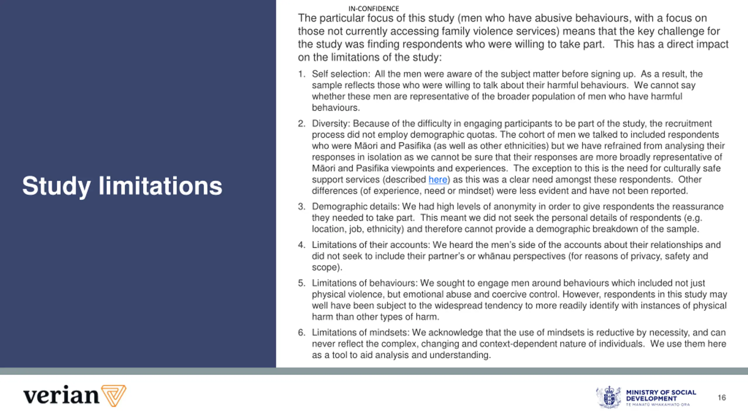 - IN-CONFIDENCE The particular focus of this study (men who have abusive behaviours, with a focus on those not currently accessing family violence services) means that the key challenge for the study was finding respondents who were willing to take part. This has a direct impact on the limitations of the study: 1. Self selection: All the men were aware of the subject matter before signing up. As a result, the sample reflects those who were willing to talk about their harmful behaviours. We cannot say whether these men are representative of the broader population of men who have harmful behaviours. 2. Diversity: Because of the difficulty in engaging participants to be part of the study, the recruitment process did not employ demographic quotas. The cohort of men we talked to included respondents who were M ori and Pasifika (as well as other ethnicities) but we have refrained from analysing their responses in isolation as we cannot be sure that their responses are more broadly representative of M ori and Pasifika viewpoints and experiences. The exception to this is the need for culturally safe support services (described here) as this was a clear need amongst these respondents. Other differences (of experience, need or mindset) were less evident and have not been reported. Study limitations 3. Demographic details: We had high levels of anonymity in order to give respondents the reassurance they needed to take part. This meant we did not seek the personal details of respondents (e.g. location, job, ethnicity) and therefore cannot provide a demographic breakdown of the sample. 4. Limitations of their accounts: We heard the men s side of the accounts about their relationships and did not seek to include their partner s or wh nau perspectives (for reasons of privacy, safety and scope). 5. Limitations of behaviours: We sought to engage men around behaviours which included not just physical violence, but emotional abuse and coercive control. However, respondents in this study may well have been subject to the widespread tendency to more readily identify with instances of physical harm than other types of harm. 6. Limitations of mindsets: We acknowledge that the use of mindsets is reductive by necessity, and can never reflect the complex, changing and context-dependent nature of individuals. We use them here as a tool to aid analysis and understanding. 16