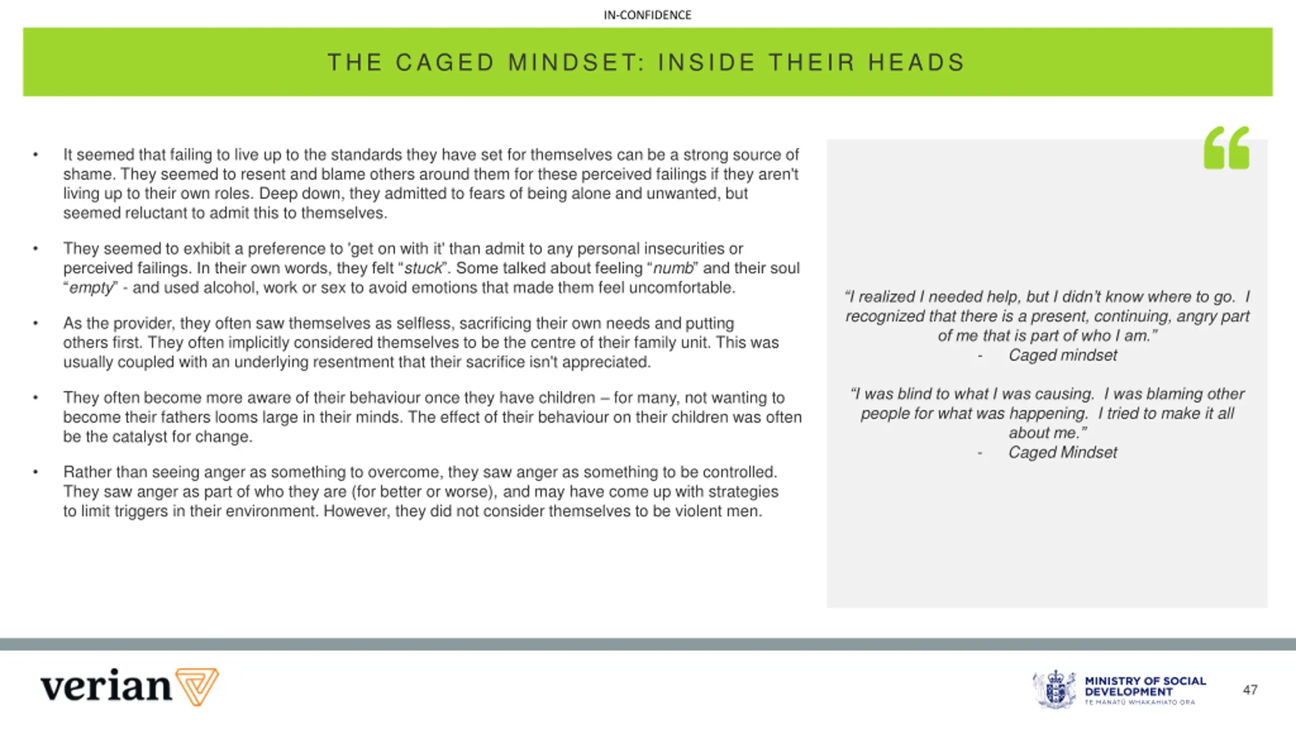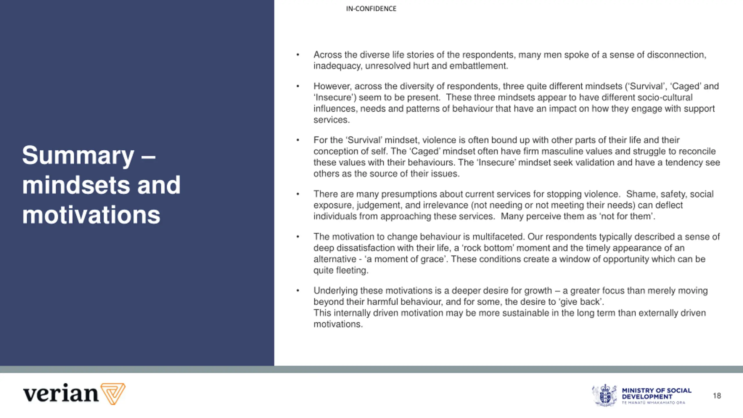 - IN-CONFIDENCE Across the diverse life stories of the respondents, many men spoke of a sense of disconnection, inadequacy, unresolved hurt and embattlement. However, across the diversity of respondents, three quite different mindsets ( Survival , Caged and Insecure ) seem to be present. These three mindsets appear to have different socio-cultural influences, needs and patterns of behaviour that have an impact on how they engage with support services. For the Survival mindset, violence is often bound up with other parts of their life and their conception of self. The Caged mindset often have firm masculine values and struggle to reconcile these values with their behaviours. The Insecure mindset seek validation and have a tendency see others as the source of their issues. Summary mindsets and motivations There are many presumptions about current services for stopping violence. Shame, safety, social exposure, judgement, and irrelevance (not needing or not meeting their needs) can deflect individuals from approaching these services. Many perceive them as not for them . The motivation to change behaviour is multifaceted. Our respondents typically described a sense of deep dissatisfaction with their life, a rock bottom moment and the timely appearance of an alternative - a moment of grace . These conditions create a window of opportunity which can be quite fleeting. Underlying these motivations is a deeper desire for growth a greater focus than merely moving beyond their harmful behaviour, and for some, the desire to give back . This internally driven motivation may be more sustainable in the long term than externally driven motivations. 18