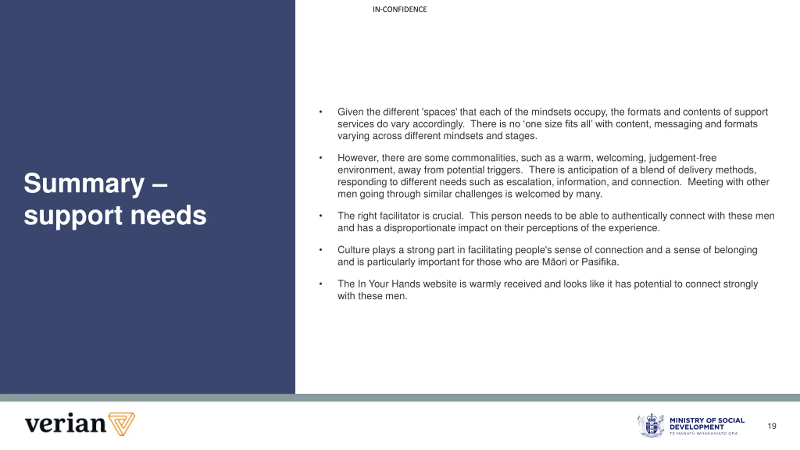 - IN-CONFIDENCE Given the different 'spaces' that each of the mindsets occupy, the formats and contents of support services do vary accordingly. There is no one size fits all with content, messaging and formats varying across different mindsets and stages. However, there are some commonalities, such as a warm, welcoming, judgement-free environment, away from potential triggers. There is anticipation of a blend of delivery methods, responding to different needs such as escalation, information, and connection. Meeting with other men going through similar challenges is welcomed by many. Summary support needs The right facilitator is crucial. This person needs to be able to authentically connect with these men and has a disproportionate impact on their perceptions of the experience. Culture plays a strong part in facilitating people's sense of connection and a sense of belonging and is particularly important for those who are M ori or Pasifika. The In Your Hands website is warmly received and looks like it has potential to connect strongly with these men. 19