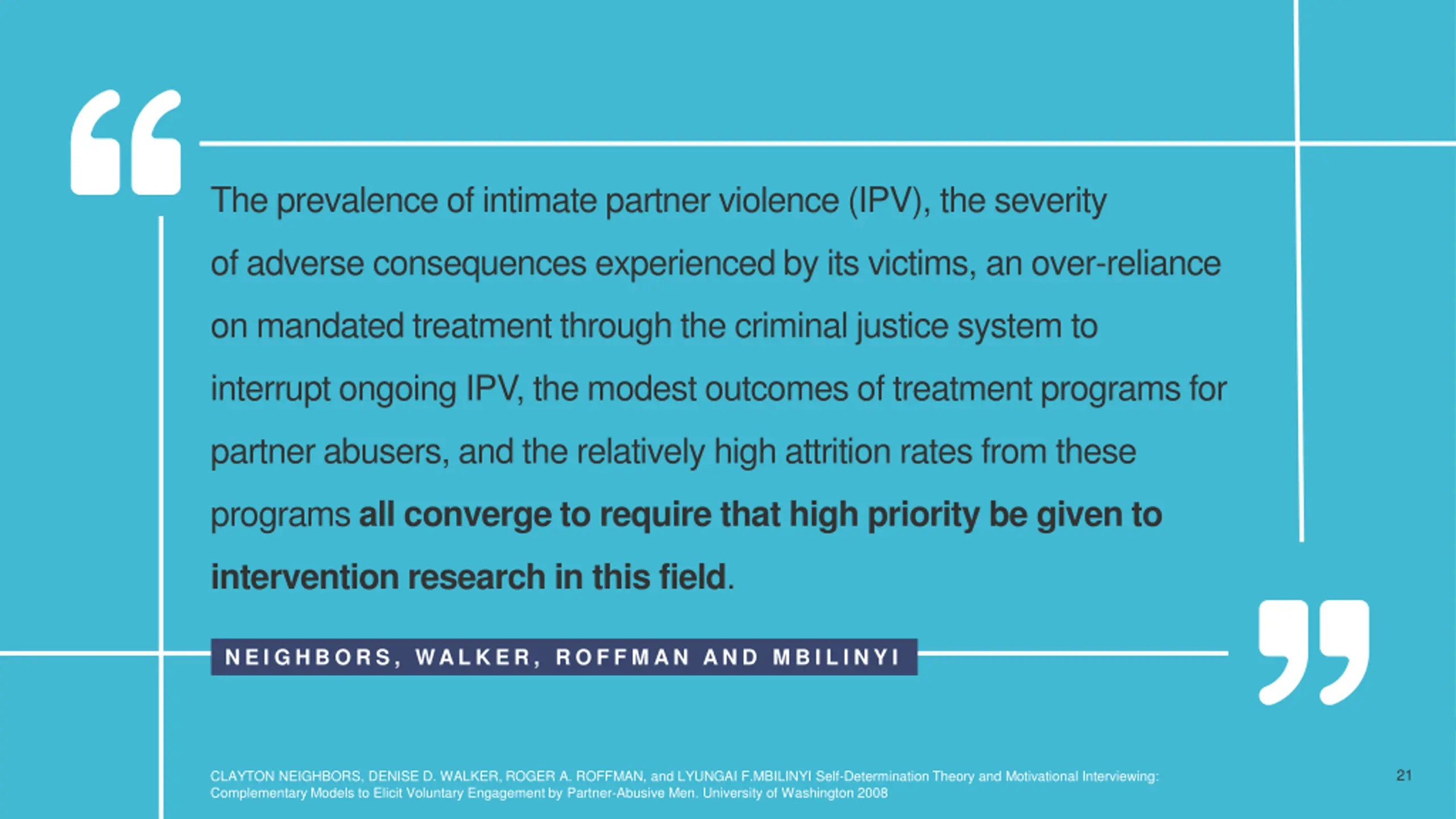 - IN-CONFIDENCE The prevalence of intimate partner violence (IPV), the severity of adverse consequences experienced by its victims, an over-reliance on mandated treatment through the criminal justice system to interrupt ongoing IPV, the modest outcomes of treatment programs for partner abusers, and the relatively high attrition rates from these programs all converge to require that high priority be given to intervention research in this field. N E I G H B O R S , WAL K E R , R O F F M AN AN D M B I L I N Y I 21 21 CLAYTON NEIGHBORS, DENISE D. WALKER, ROGER A. ROFFMAN, and LYUNGAI F.MBILINYI Self-Determination Theory and Motivational Interviewing: Complementary Models to Elicit Voluntary Engagement by Partner-Abusive Men. University of Washington 2008