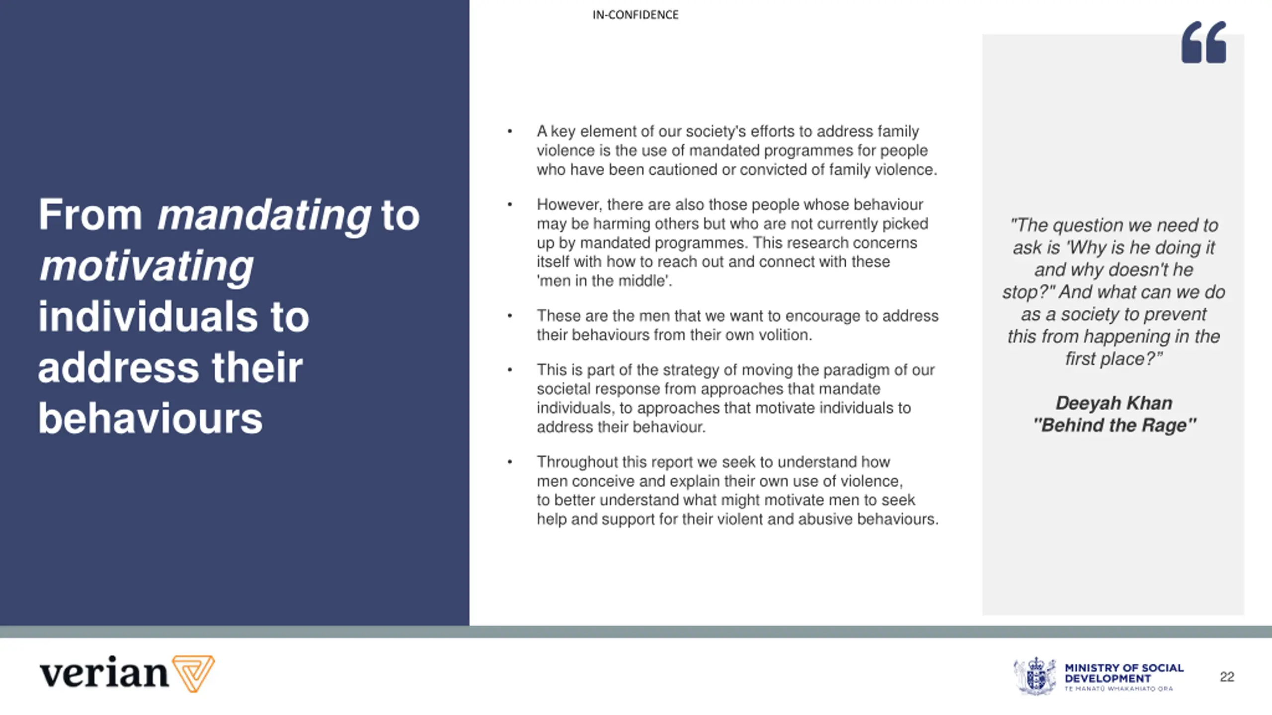 - IN-CONFIDENCE A key element of our society's efforts to address family violence is the use of mandated programmes for people who have been cautioned or convicted of family violence. From mandating to motivating individuals to address their behaviours However, there are also those people whose behaviour may be harming others but who are not currently picked up by mandated programmes. This research concerns itself with how to reach out and connect with these 'men in the middle'. "The question we need to ask is 'Why is he doing it and why doesn't he stop?" And what can we do as a society to prevent this from happening in the first place? These are the men that we want to encourage to address their behaviours from their own volition. This is part of the strategy of moving the paradigm of our societal response from approaches that mandate individuals, to approaches that motivate individuals to address their behaviour. Deeyah Khan "Behind the Rage" Throughout this report we seek to understand how men conceive and explain their own use of violence, to better understand what might motivate men to seek help and support for their violent and abusive behaviours. 22