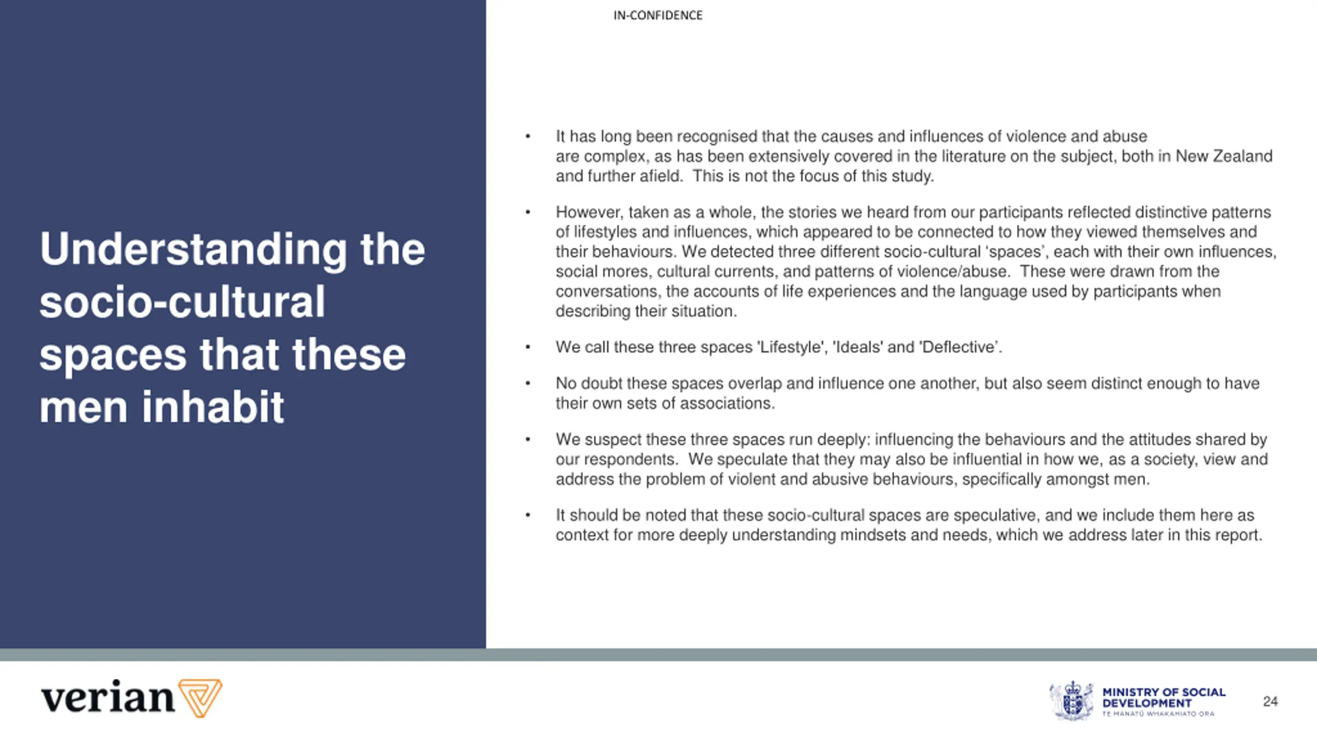 - IN-CONFIDENCE It has long been recognised that the causes and influences of violence and abuse are complex, as has been extensively covered in the literature on the subject, both in New Zealand and further afield. This is not the focus of this study. However, taken as a whole, the stories we heard from our participants reflected distinctive patterns of lifestyles and influences, which appeared to be connected to how they viewed themselves and their behaviours. We detected three different socio-cultural spaces , each with their own influences, social mores, cultural currents, and patterns of violence/abuse. These were drawn from the conversations, the accounts of life experiences and the language used by participants when describing their situation. Understanding the socio-cultural spaces that these men inhabit We call these three spaces 'Lifestyle', 'Ideals' and 'Deflective . No doubt these spaces overlap and influence one another, but also seem distinct enough to have their own sets of associations. We suspect these three spaces run deeply: influencing the behaviours and the attitudes shared by our respondents. We speculate that they may also be influential in how we, as a society, view and address the problem of violent and abusive behaviours, specifically amongst men. It should be noted that these socio-cultural spaces are speculative, and we include them here as context for more deeply understanding mindsets and needs, which we address later in this report. 24