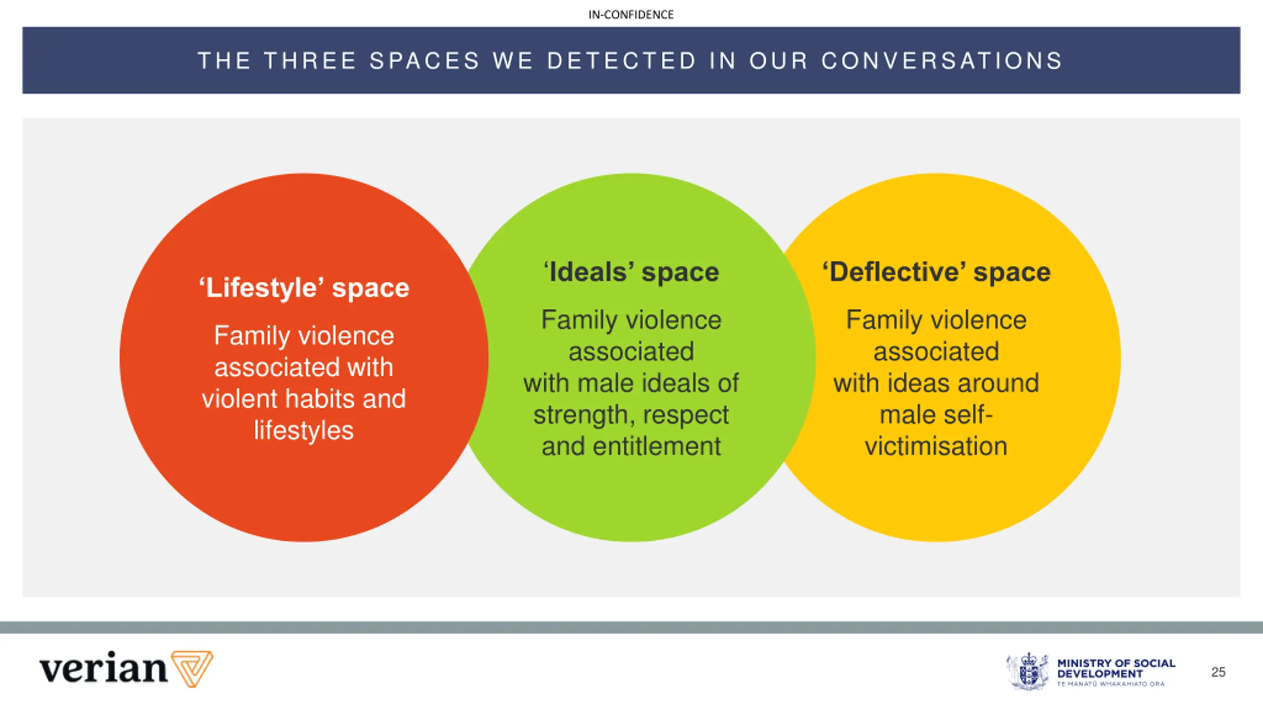 - IN-CONFIDENCE THE THREE SPACES WE DETECTED IN OUR CONVERSATIONS Ideals space Deflective space Lifestyle space Family violence associated with male ideals of strength, respect and entitlement Family violence associated with ideas around male self- victimisation Family violence associated with violent habits and lifestyles 25